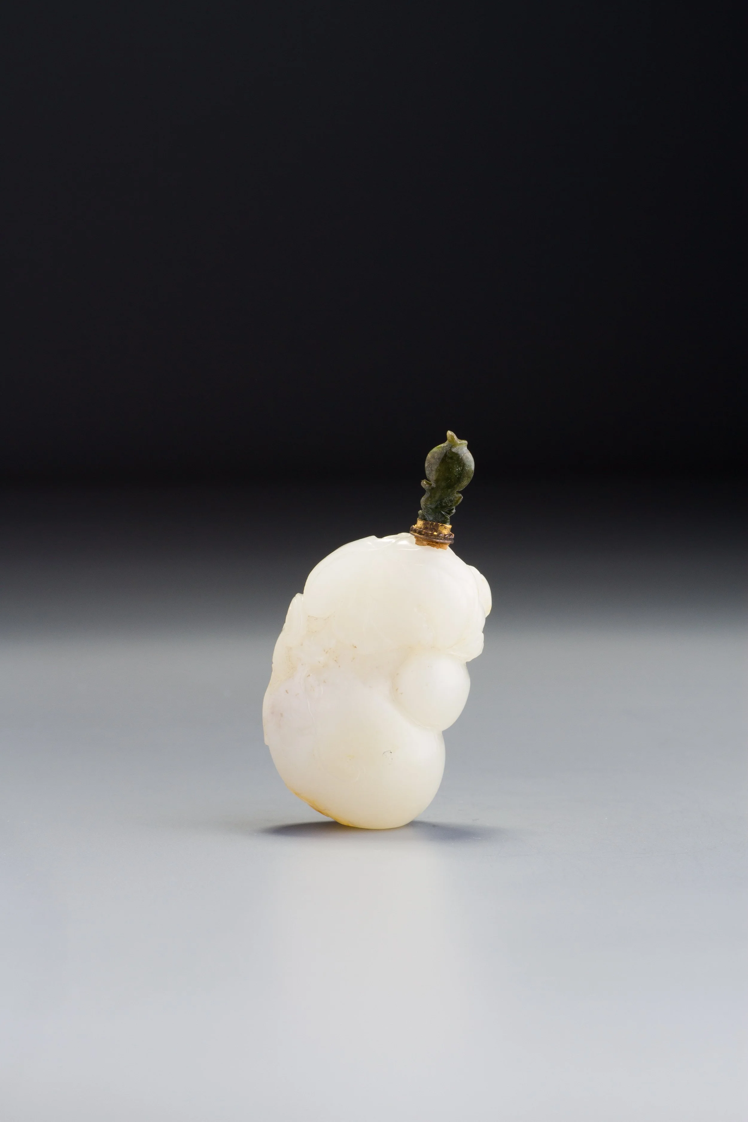 Translucent white nephrite of pebble material with some beige-brown inner skin; a pendant converted to a snuff bottle and carved in the form of a severed, leafy, vine from which one large and one small double gourd grow, the larger gourd hollowed to form the bottle, and with curling tendrils, with a bat in flight also in relief.