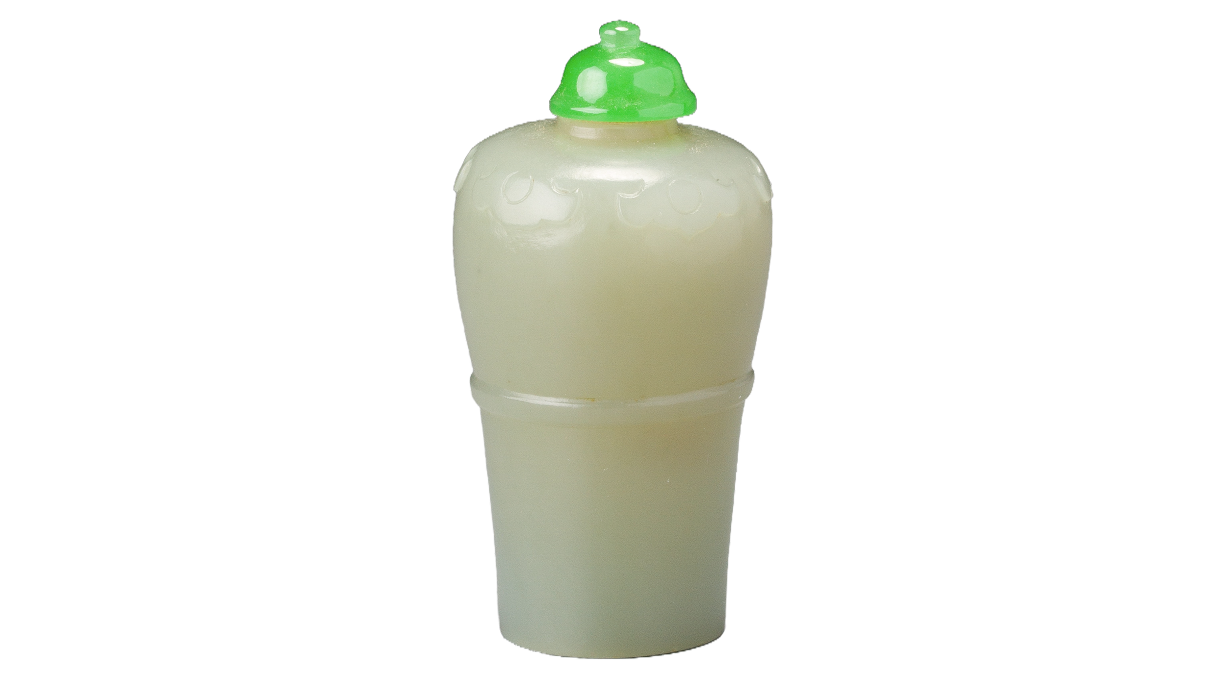 Translucent, flawless grey nephrite; well hollowed with a wide mouth, convex lip, and recessed flat, circular foot; carved around the centre of the body with a horizontal, raised rib and at the shoulders with a mantle of five formalized lingzhi heads.