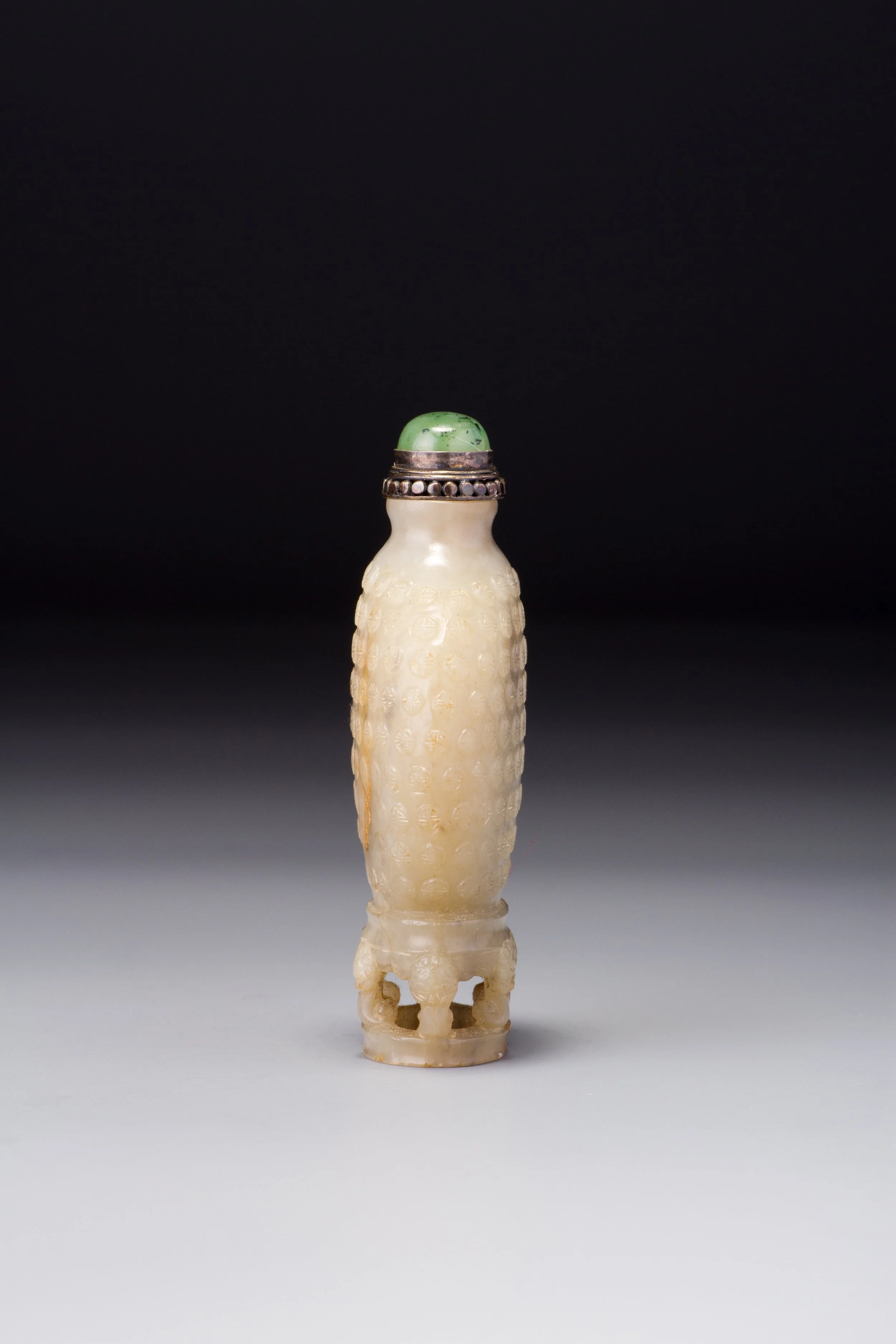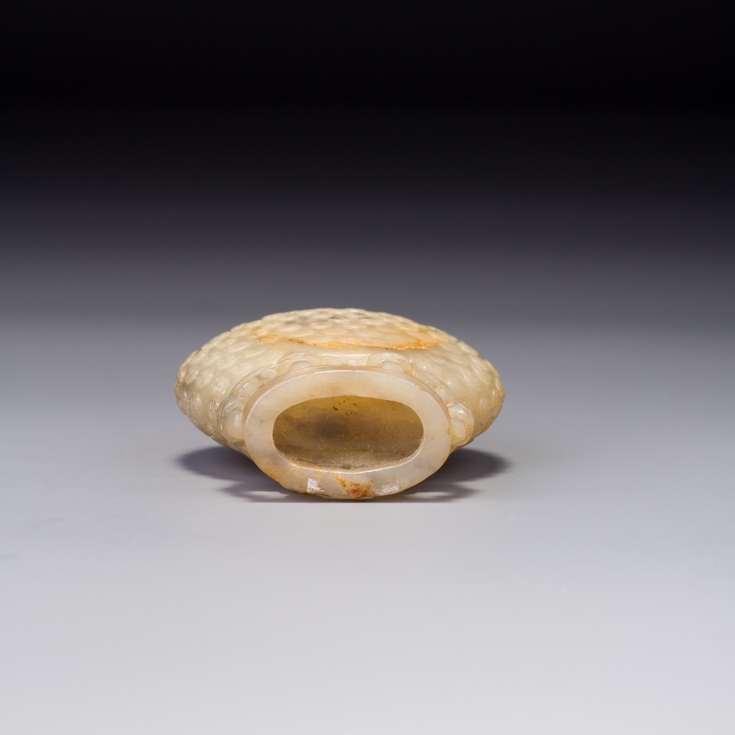Translucent mottled grey nephrite: with a concave lip and flat footrim made up of elements of the design; in the form of a flattened flask carved with multiple shou (‘longevity’) characters, set on an integral, openwork stand with six cabriole legs each made up of a taotie consuming its own body.