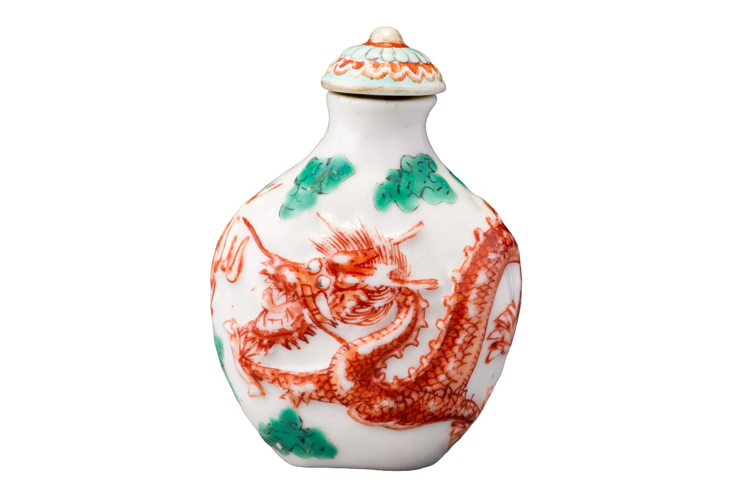 Stopper: porcelain with green, iron-red, black and gold enamel, moulded with a formalized chrysanthemum design.