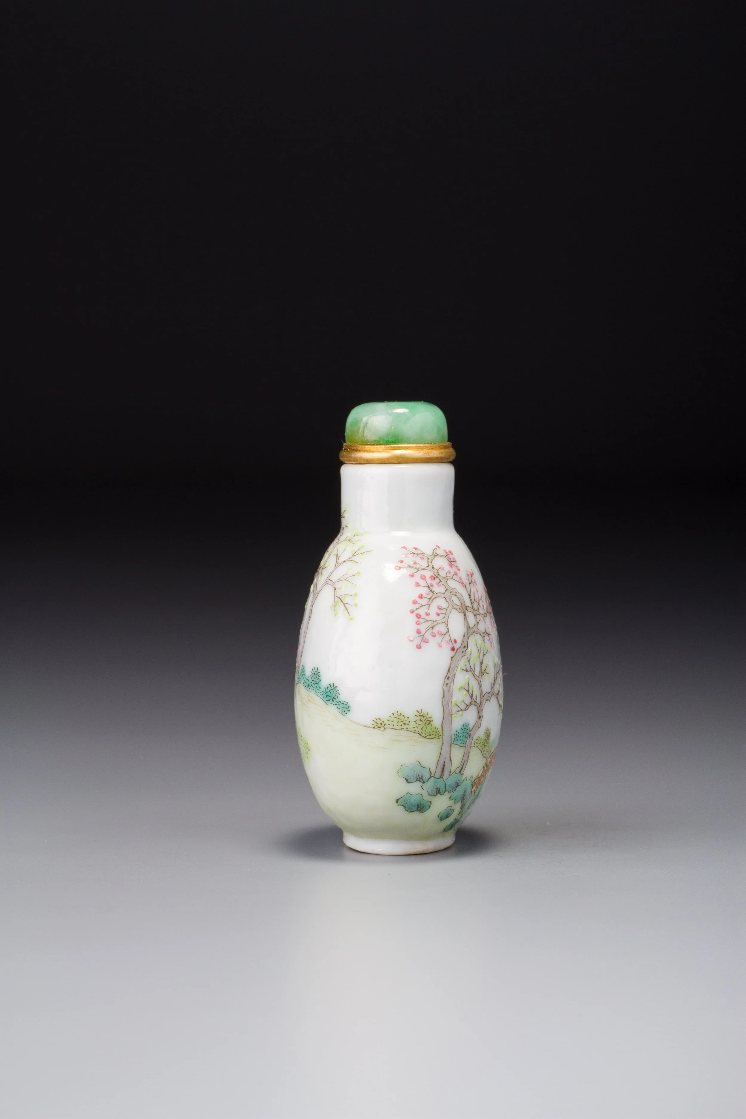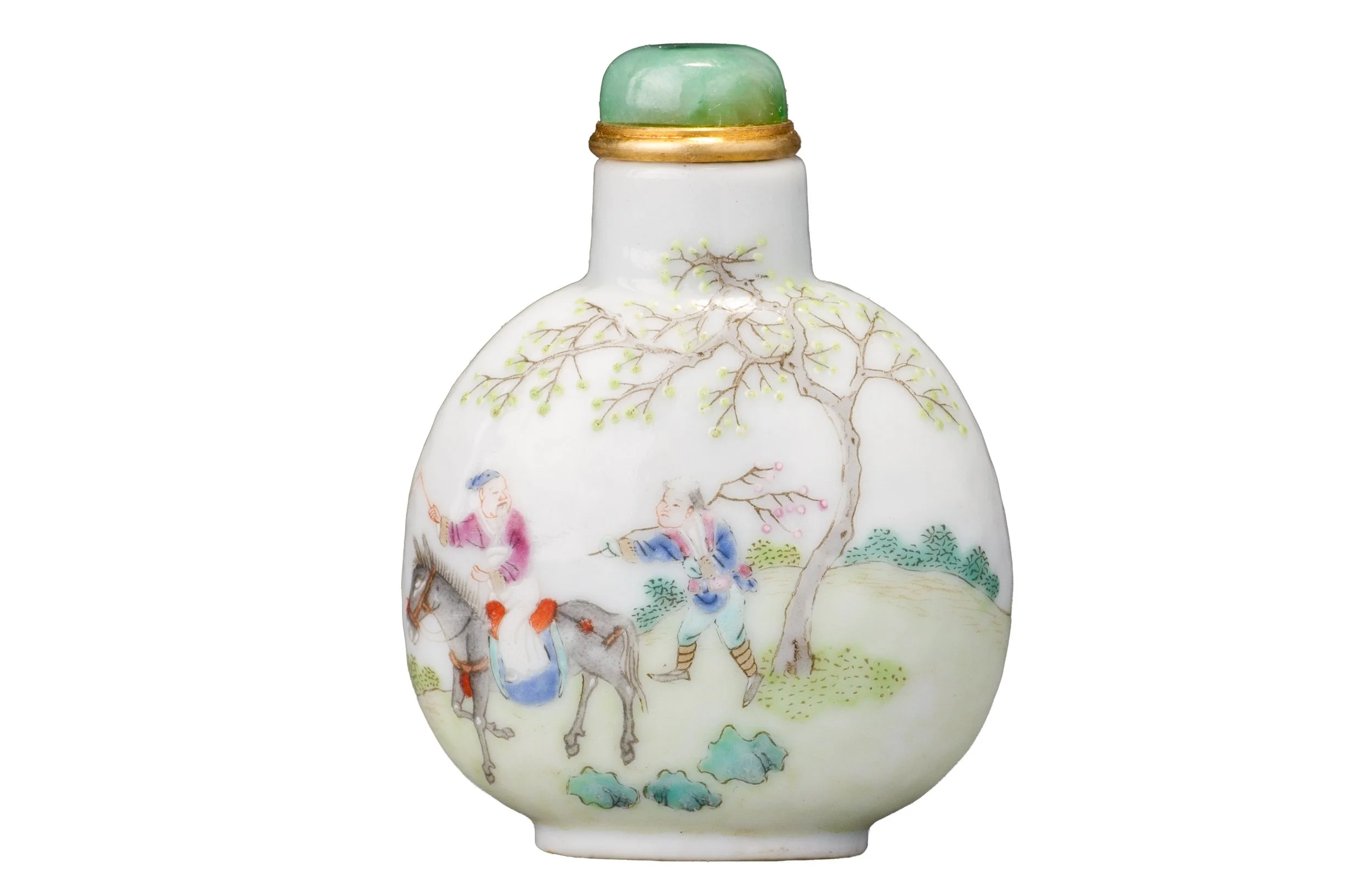 Famille rose enamels on colourless glaze on porcelain; with a slightly convex lip, and recessed flat, oval foot surrounded by a protruding flattened, oval foot rim; painted with a continuous scene of Meng Haoran on his donkey, followed by an attendant on foot holding a branch of prunus blossoms in a water-side landscape with a blossoming tree, possibly a white prunus, heading towards a small stone bridge across an inlet towards another similar tree with pink blossoming prunus, the far bank with a country residence and a small open pavilion, the foot inscribed in iron-red regular script Daoguang nian zhi 道光年製 (‘Made in the Daoguang era’), the interior glazed.