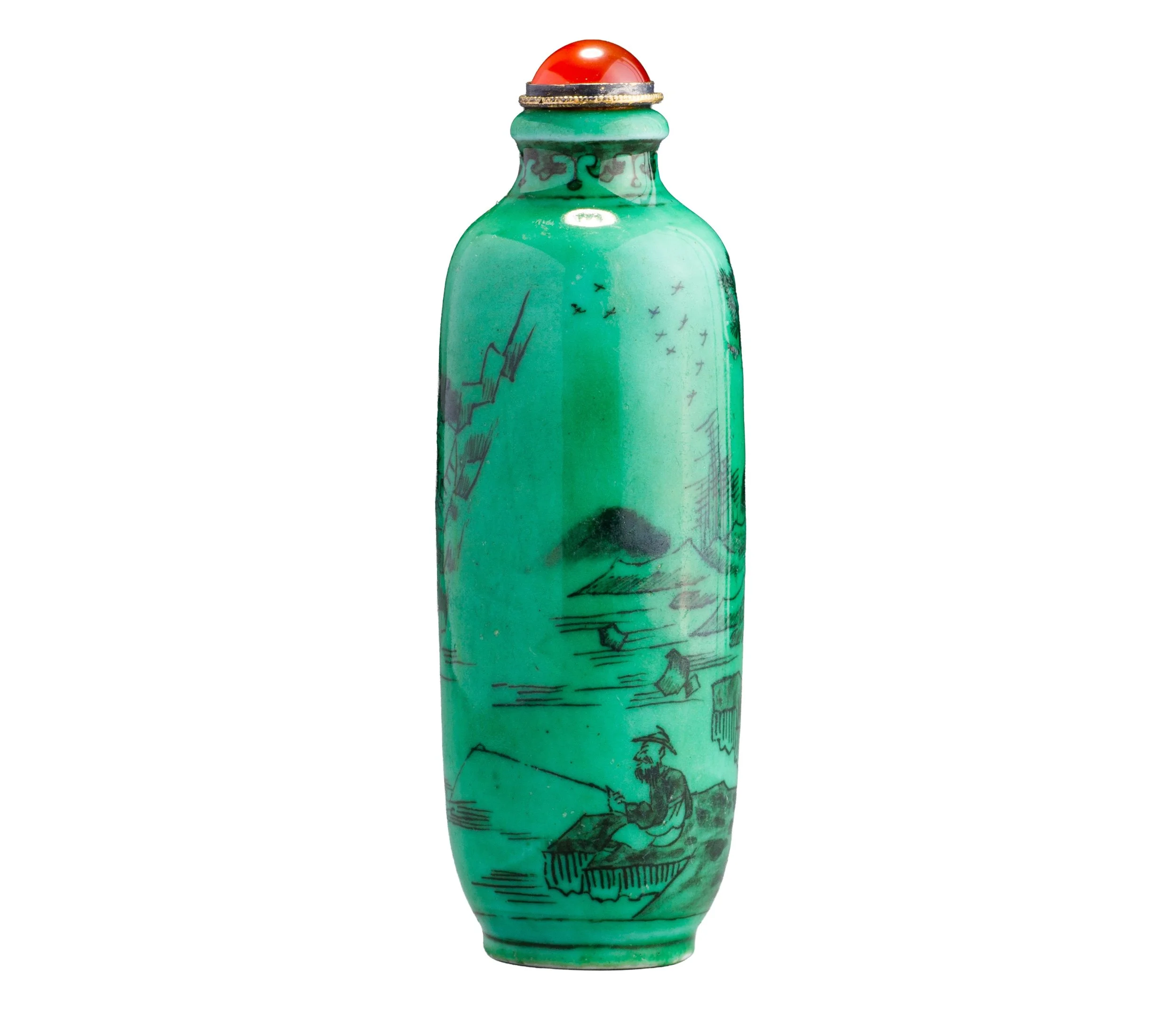 Transparent emerald-green glaze on black pigment on porcelain; with a convex lip, flat foot, and convex foot rim; painted beneath the glaze with a wrap-around, mountainous landscape scene with a scholar reading in his waterside pavilion, plus the traditionally idealised philosopher-recluses, a fisherman and a woodcutter, beneath a neck-band of formalized lingzhi; the interior with a thin, colourless glaze.