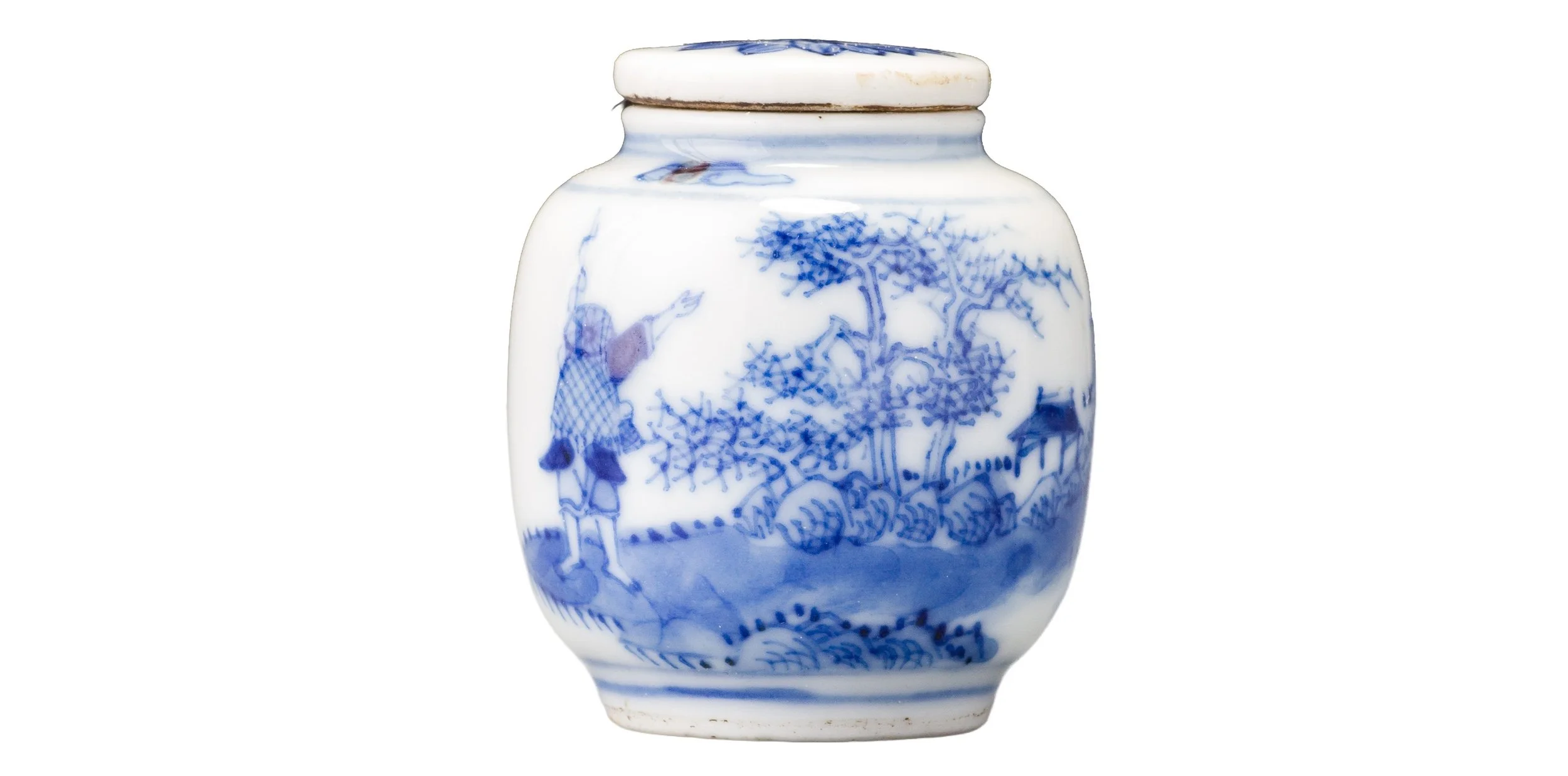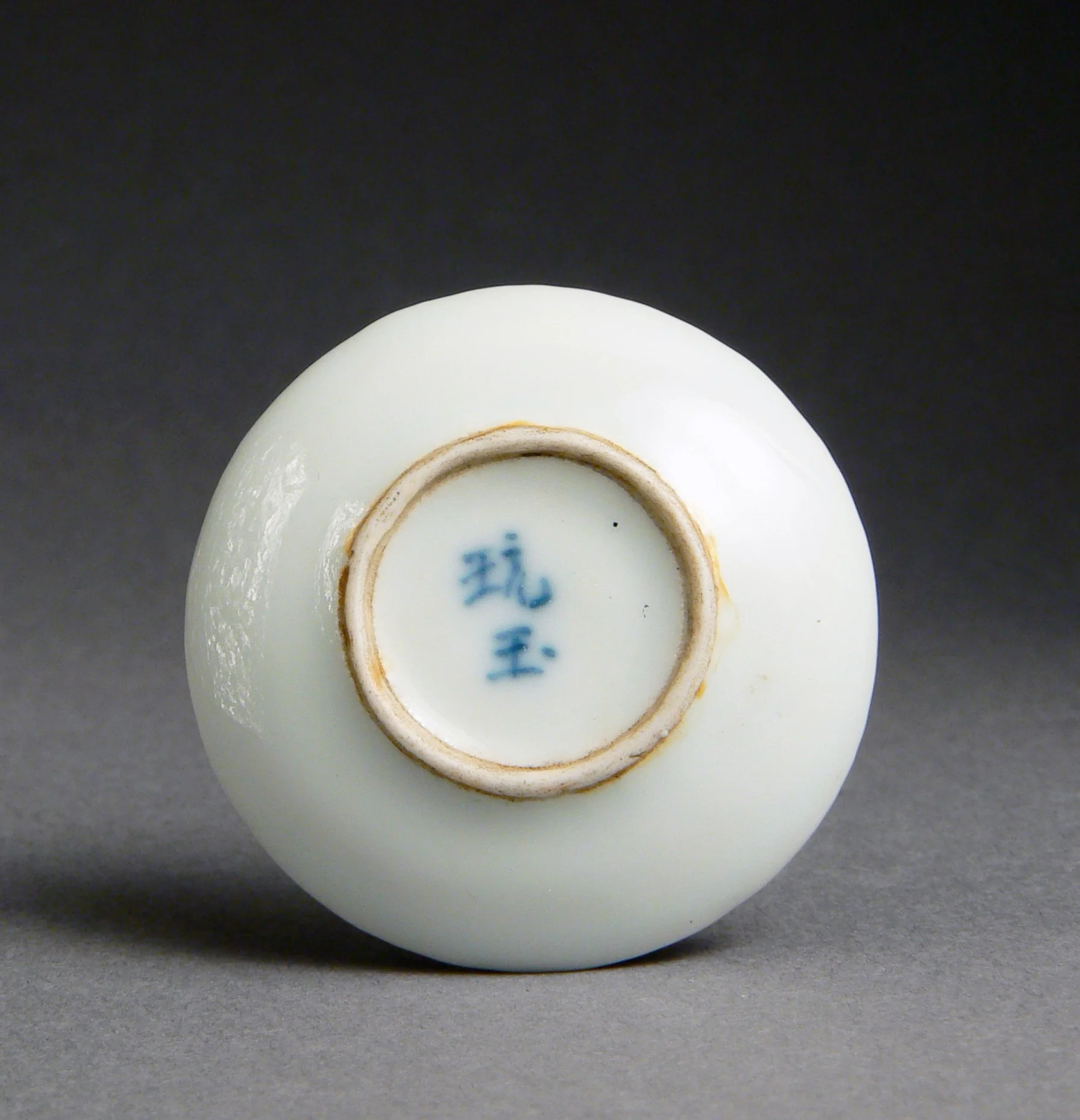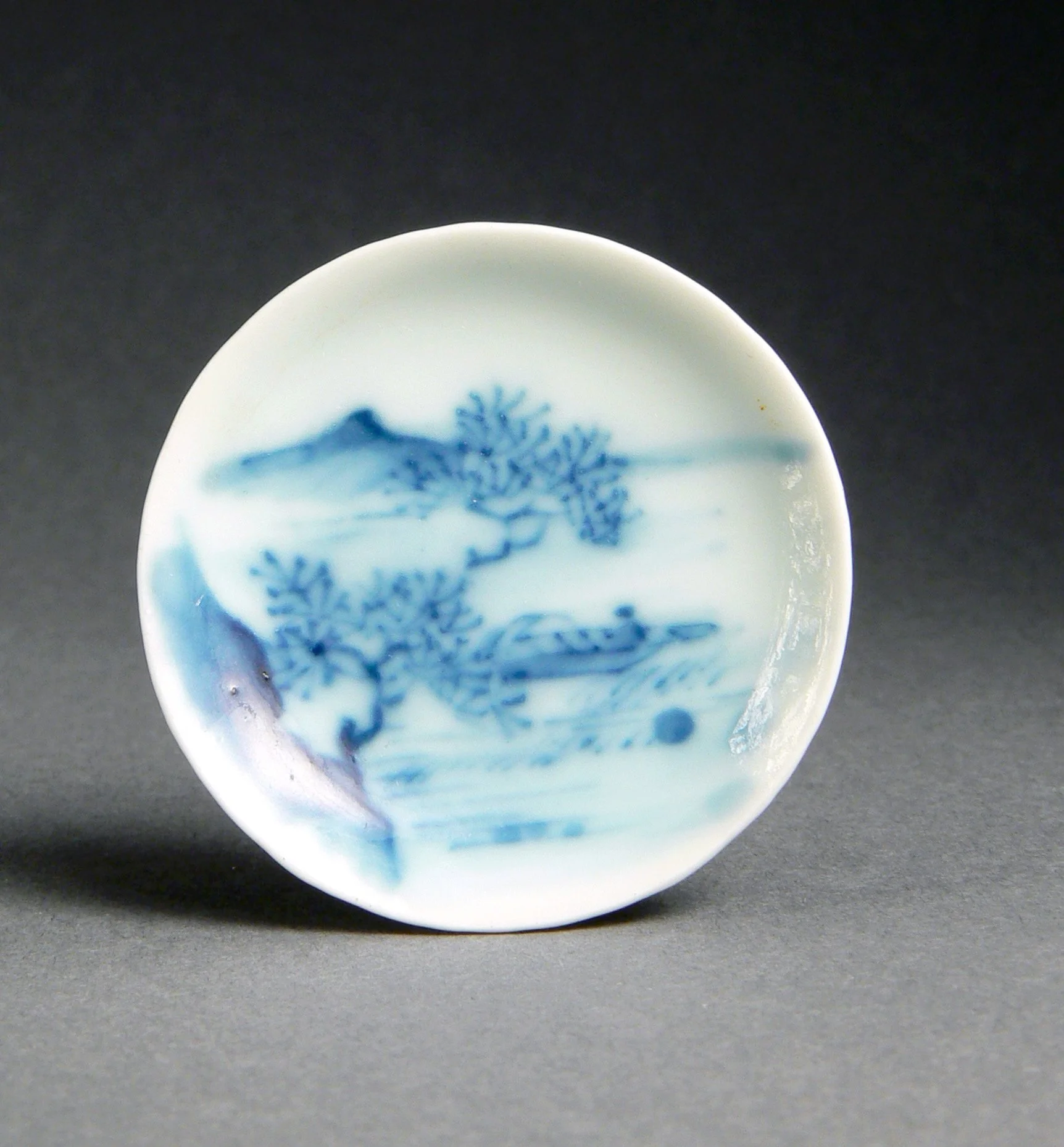 Includes matching snuff dish of colourless glaze on cobalt pigment on white porcelain; a dish, set on a protruding, circular, convex footrim; painted in underglaze blue with a fisherman in a partially covered skiff on a lake or river with a foreground tree growing from a rocky outcrop, and distant hills on the far bank, the foot inscribed 玩玉 Wanyu (‘Precious jade’)
