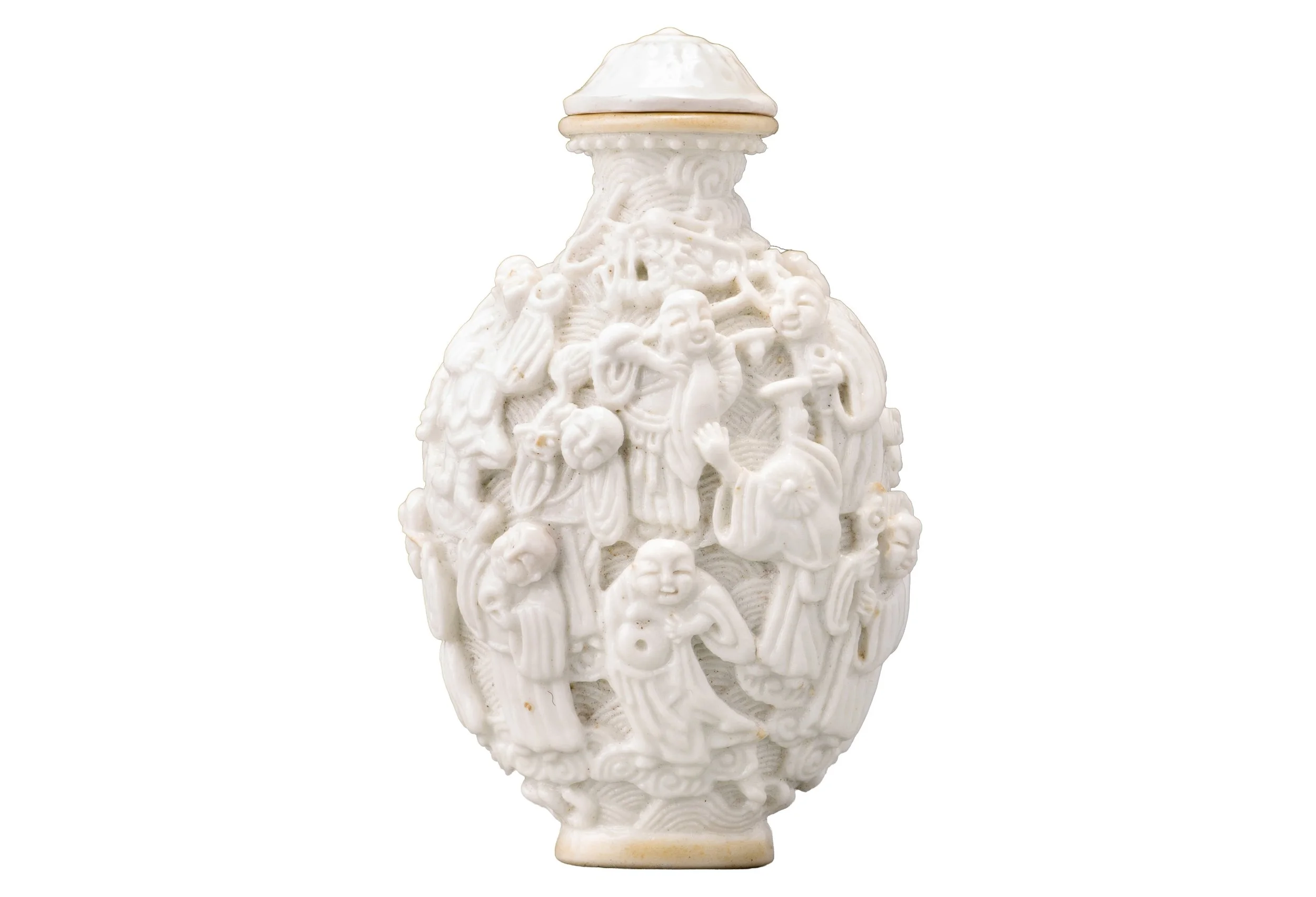 Colourless and slightly beige glaze on white porcelain; moulded in relief with a continuous scene of the Eighteen Luohan with various attributes (a pagoda, a staff, a pair of symbols, long eyebrows, a face of Buddha in the chest, a pearl, a crutch, and a fat belly), one holding a ring and riding a tiger, another holding a Buddhist lion, and with a dragon above conjured by another, all set on formalized clouds against a wave-pattern ground, the upper neck with a band of raised dots, the lip and foot rim with a pale beige glaze, and originally gilt