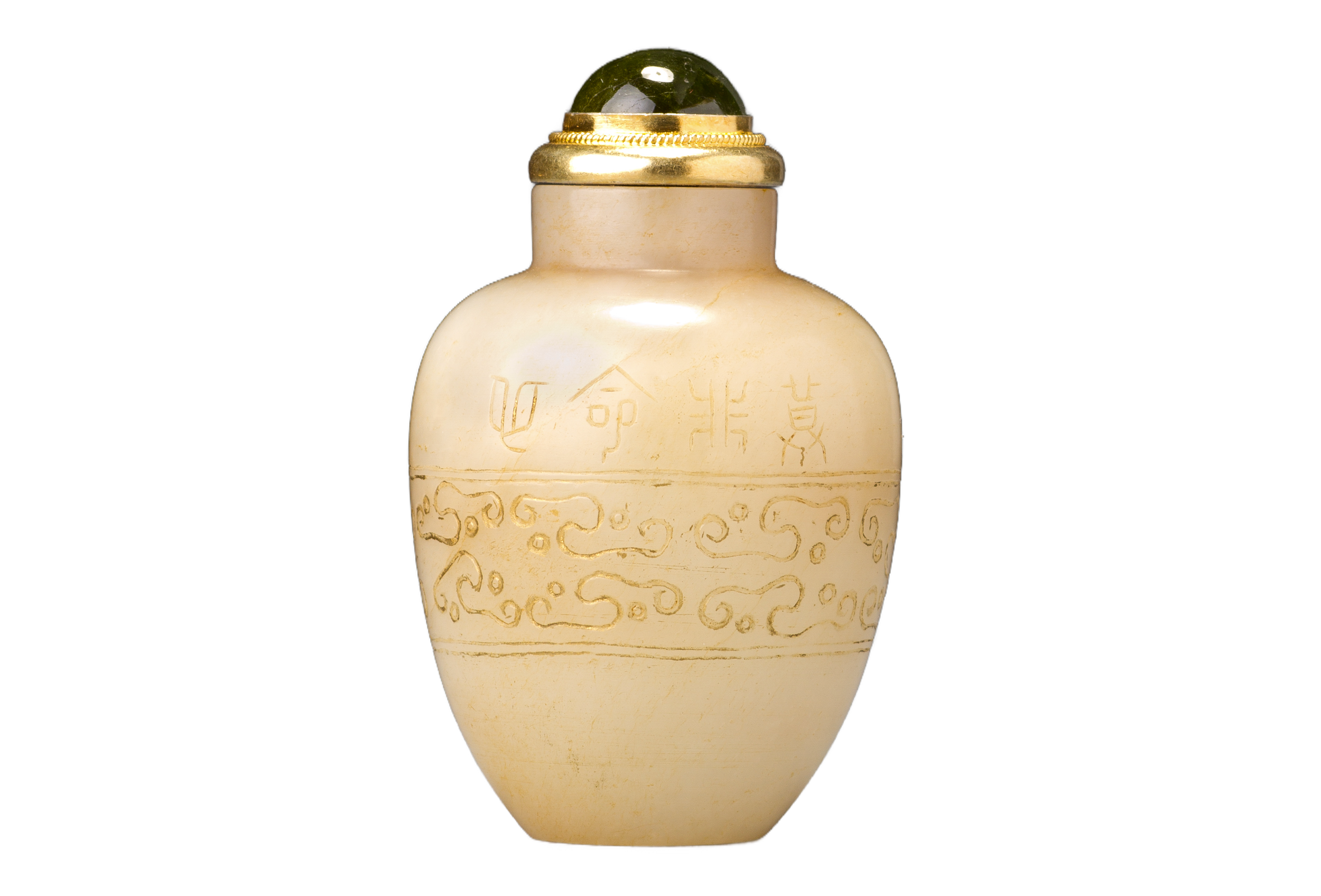 Translucent variegated beige nephrite; with a wide mouth, flat lip and recessed, concave circular foot; carved with a horizontal band around the centre of the body with formalized archaic clouds and dots between double-line borders, beneath two inscriptions in seal script順受其正 Shunshou qizheng and 莫非命也 Mofei mingye.
