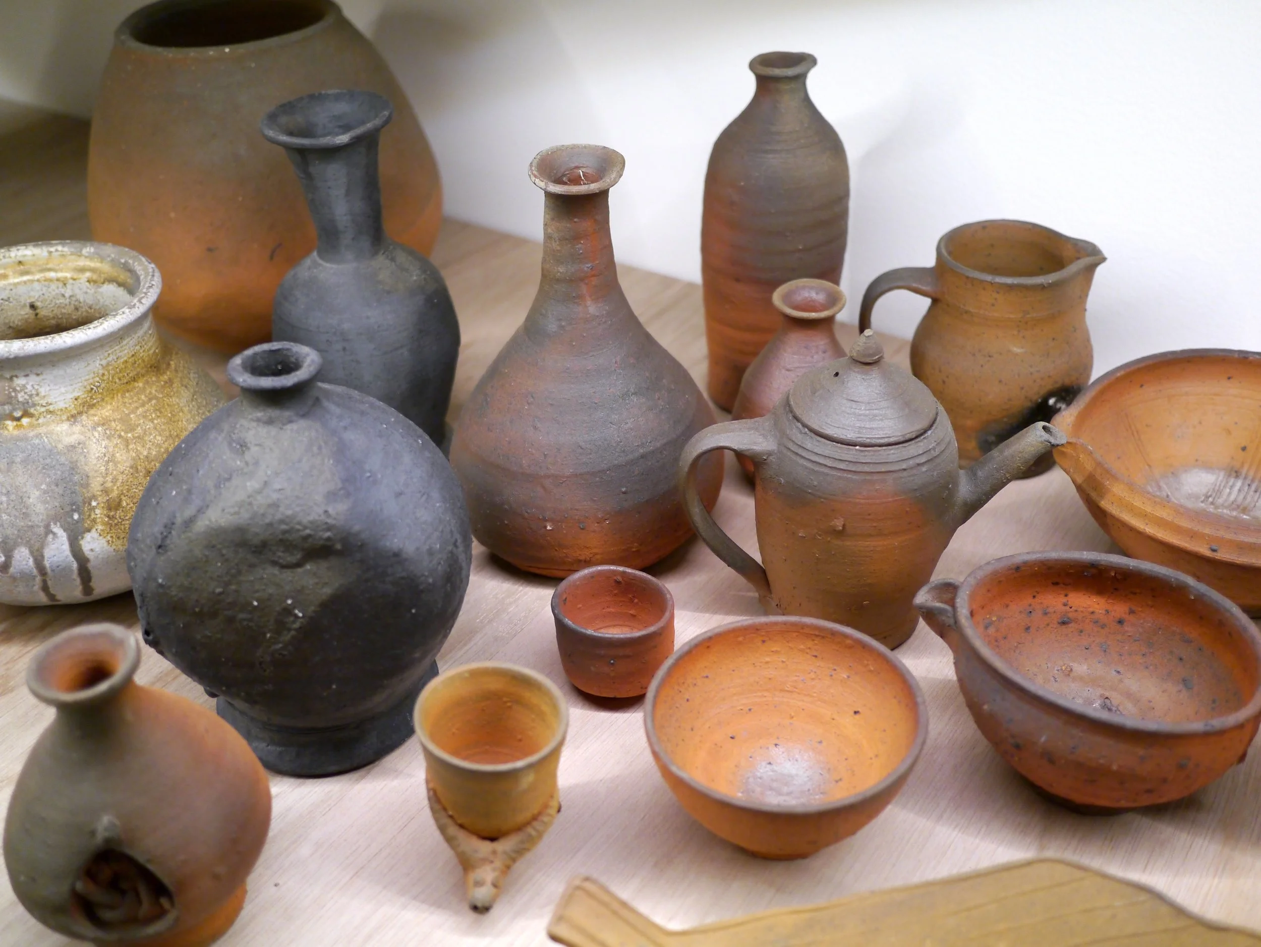 Upon entering the exhibition at Japan House, the viewer is immediately struck by the physical nature of the display. The space has been kept open plan and, rather than using more common gallery methods of display such as plinths, shelves or cabinets, a natural wooden supporting structure has been constructed which creates a surface at approximately waist height. Similar in scale to a domestic kitchen work surface. Lighting is installed directly overhead where you might expect the kitchen cabinets to be, giving the overall display an intimate feel. The very first reaction I had was of disappointment that the objects could not be picked up and held, although I was warned of this prior to entering, and is completely understandable given the nature of the show. Still, the exhibition has been created in such a way that the viewer is situated in direct physical relationship to the objects, which are neither elevated not separated from the surrounding space. The wooden structure flows organically around the room, inviting you to move through the space and appreciate each object on its own merits, on equal terms with the rest of the collection. Name plates and titles of works are minimal and upon first sight, the room reads as much as a vast pot sale as it does a contemporary exhibition display.