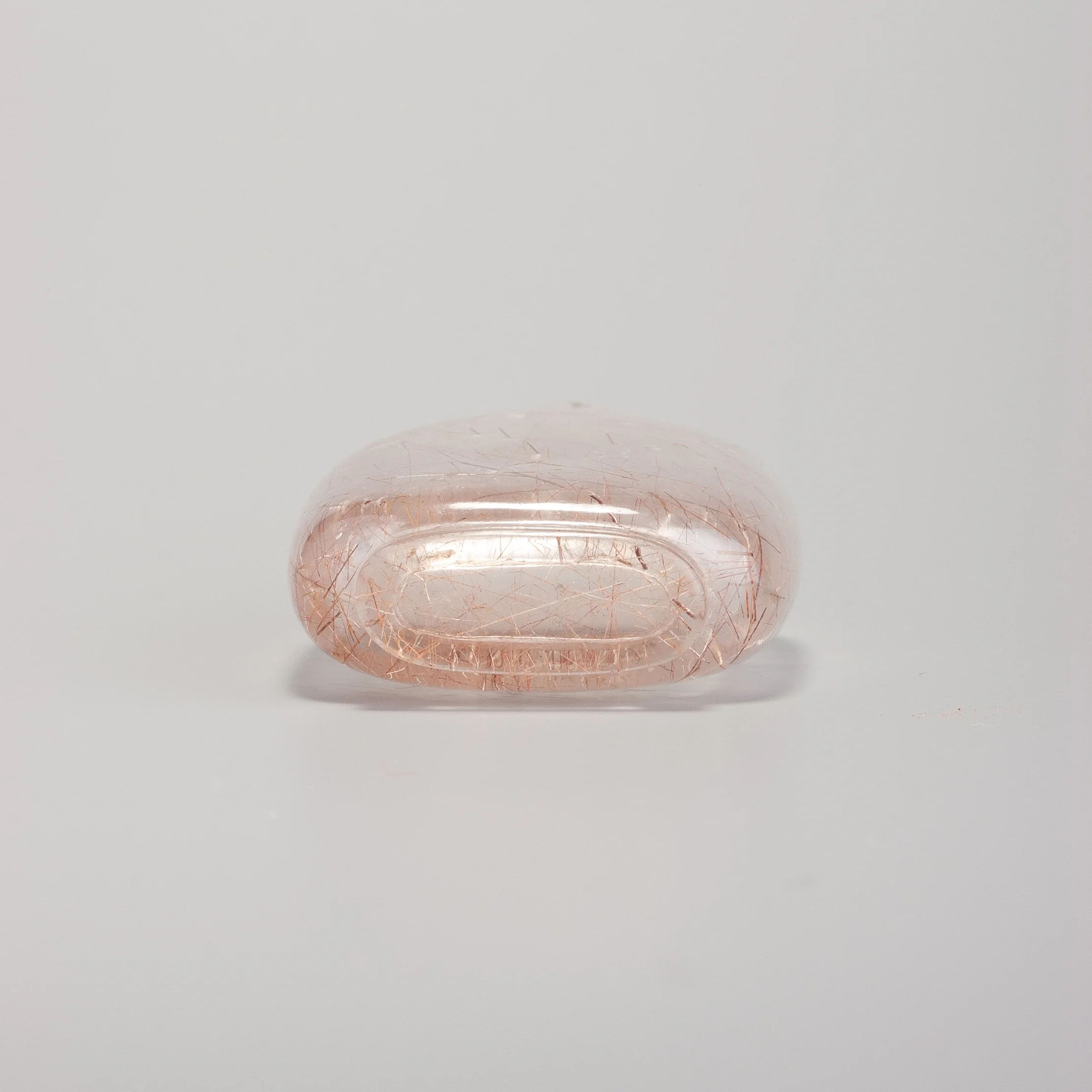 Colourless crystal and coppery-red rutile crystals; well hollowed with a slightly concave lip and recessed, flat foot surrounded by a protruding, convex footrim; the crystal even suffused with varying thicknesses of rutile crystals resembling reeds.