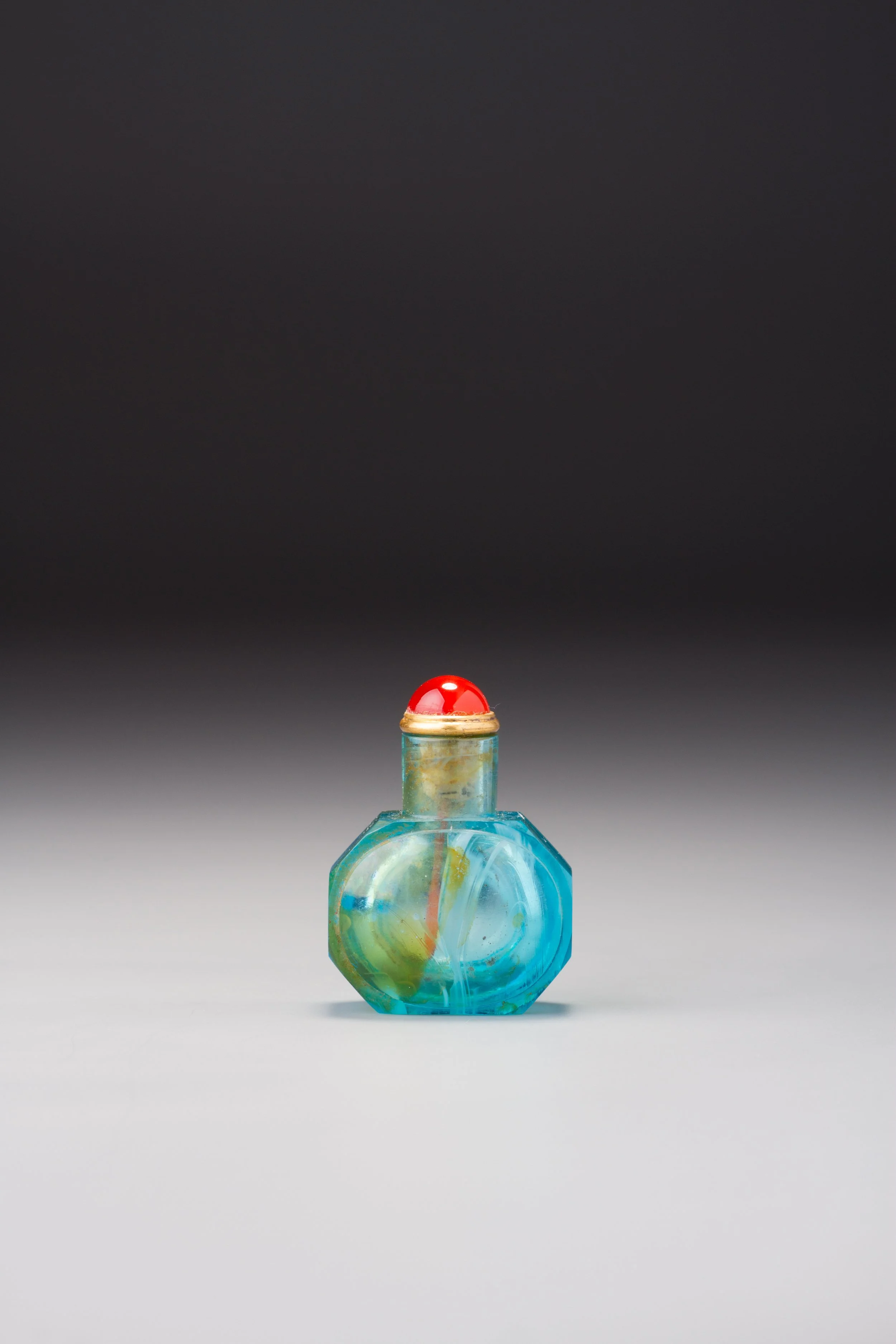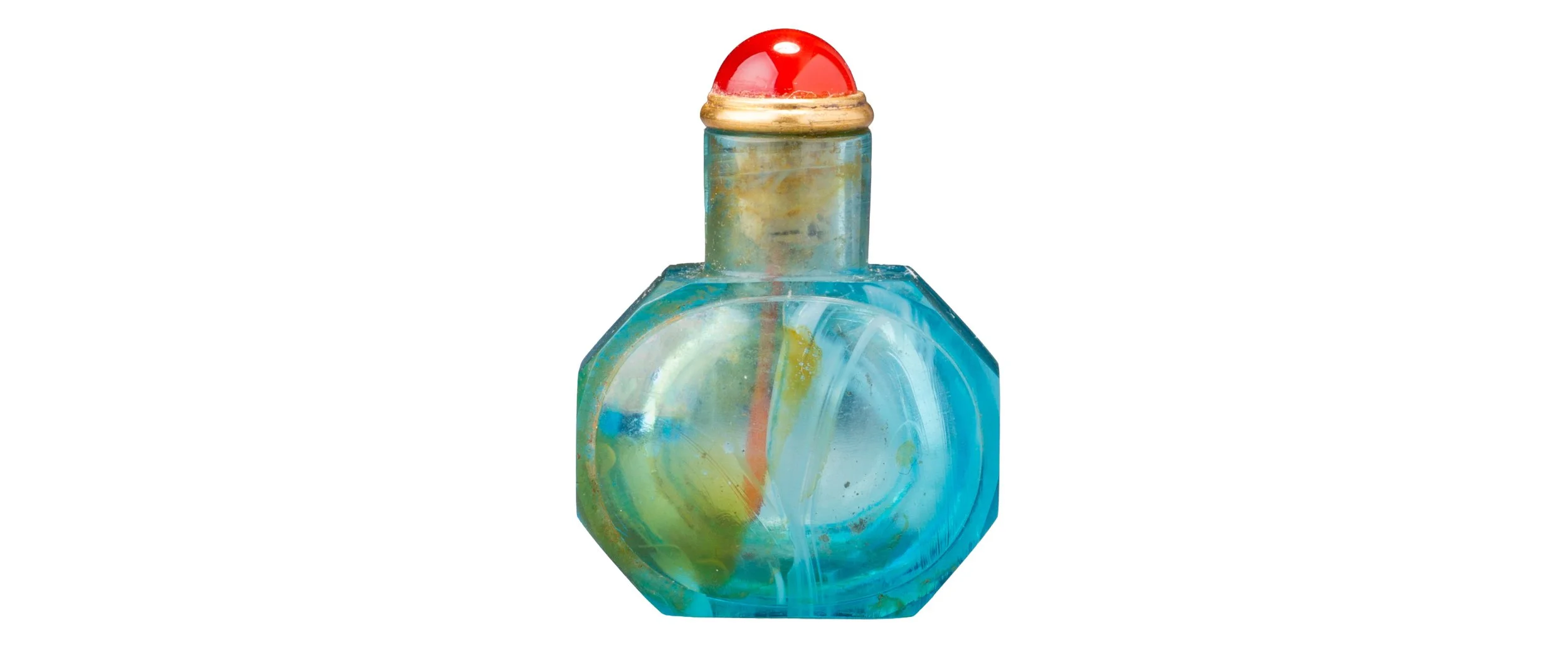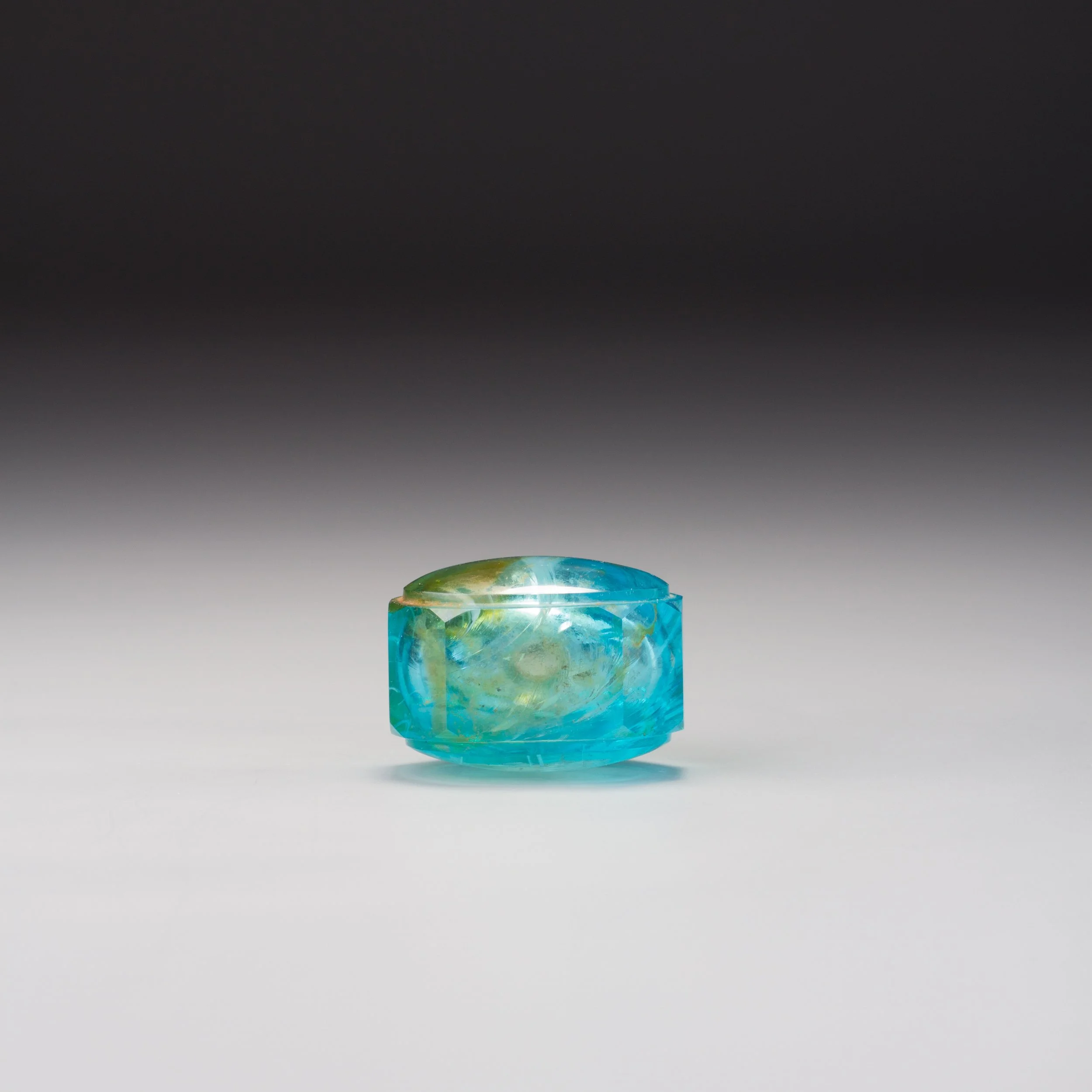 Transparent aquamarine glass with swirls of pale brown and whitish glass; of compressed horizontal ovoid form with a tall cylindrical neck, flat lip and flat, rectangular foot, the body faceted overall, the main sides each with a convex raised oval panel, set on an octagonal profile defined by rectangular side, neck and base panels, their corners slightly beveled, the last forming the foot .