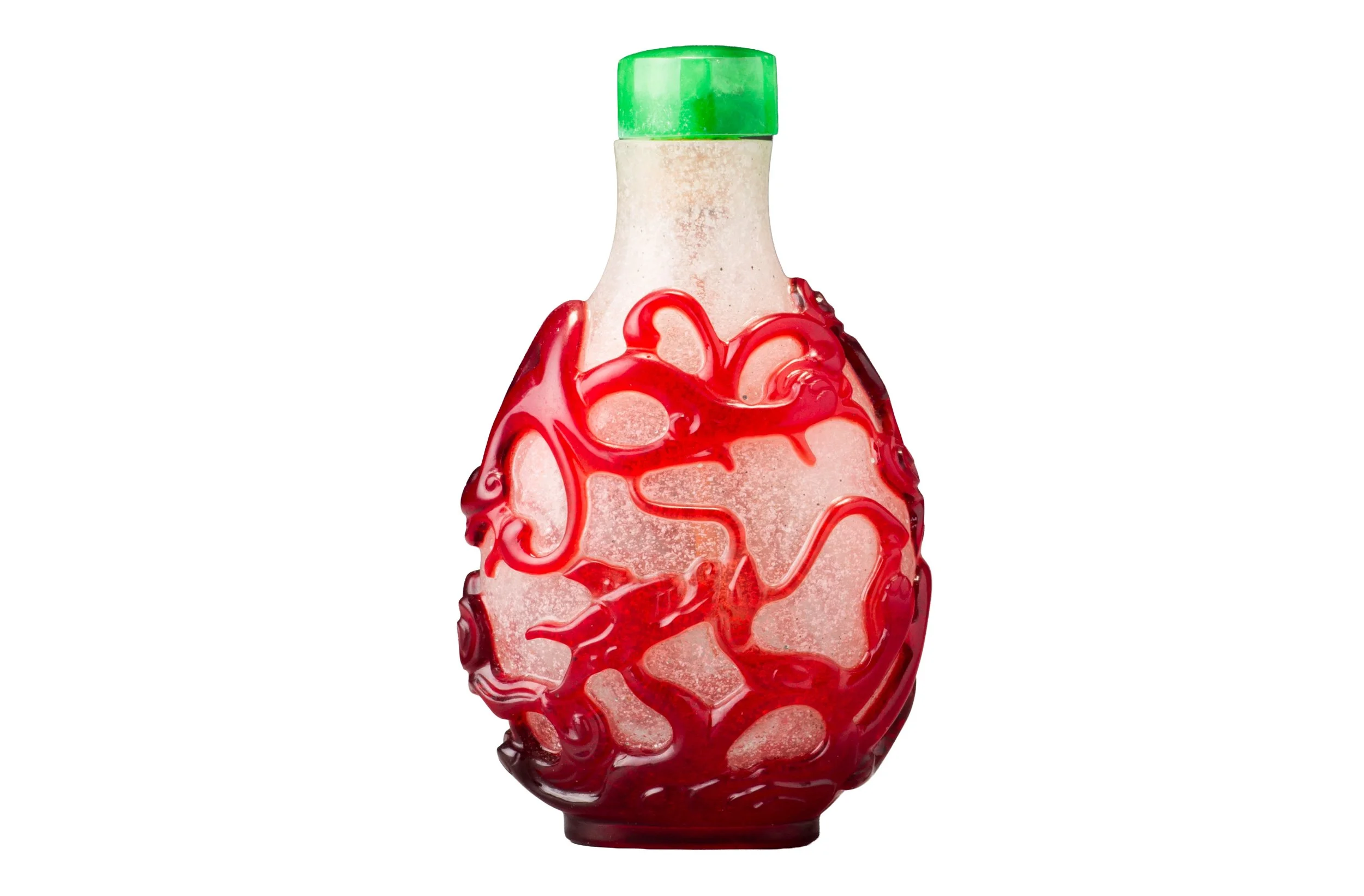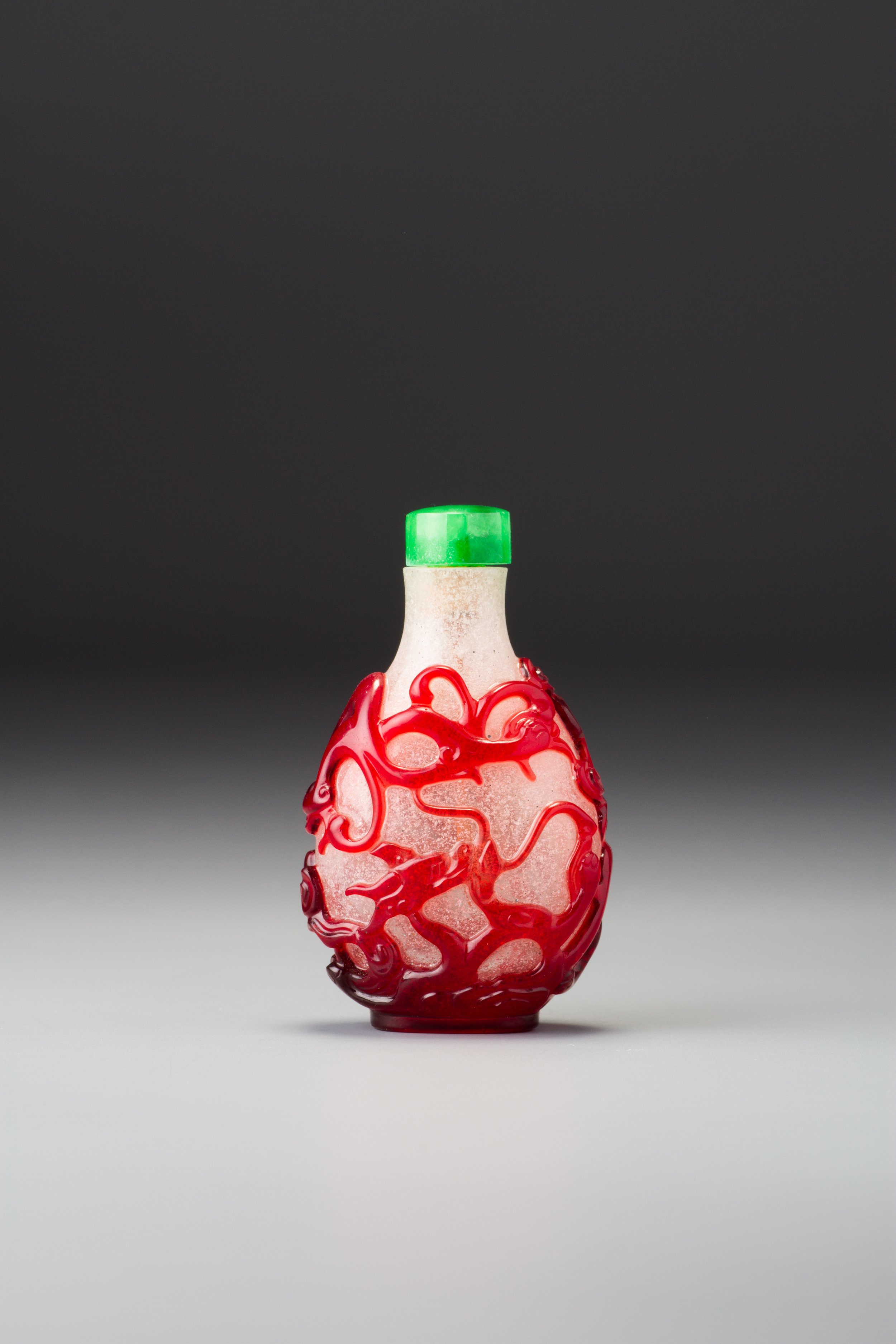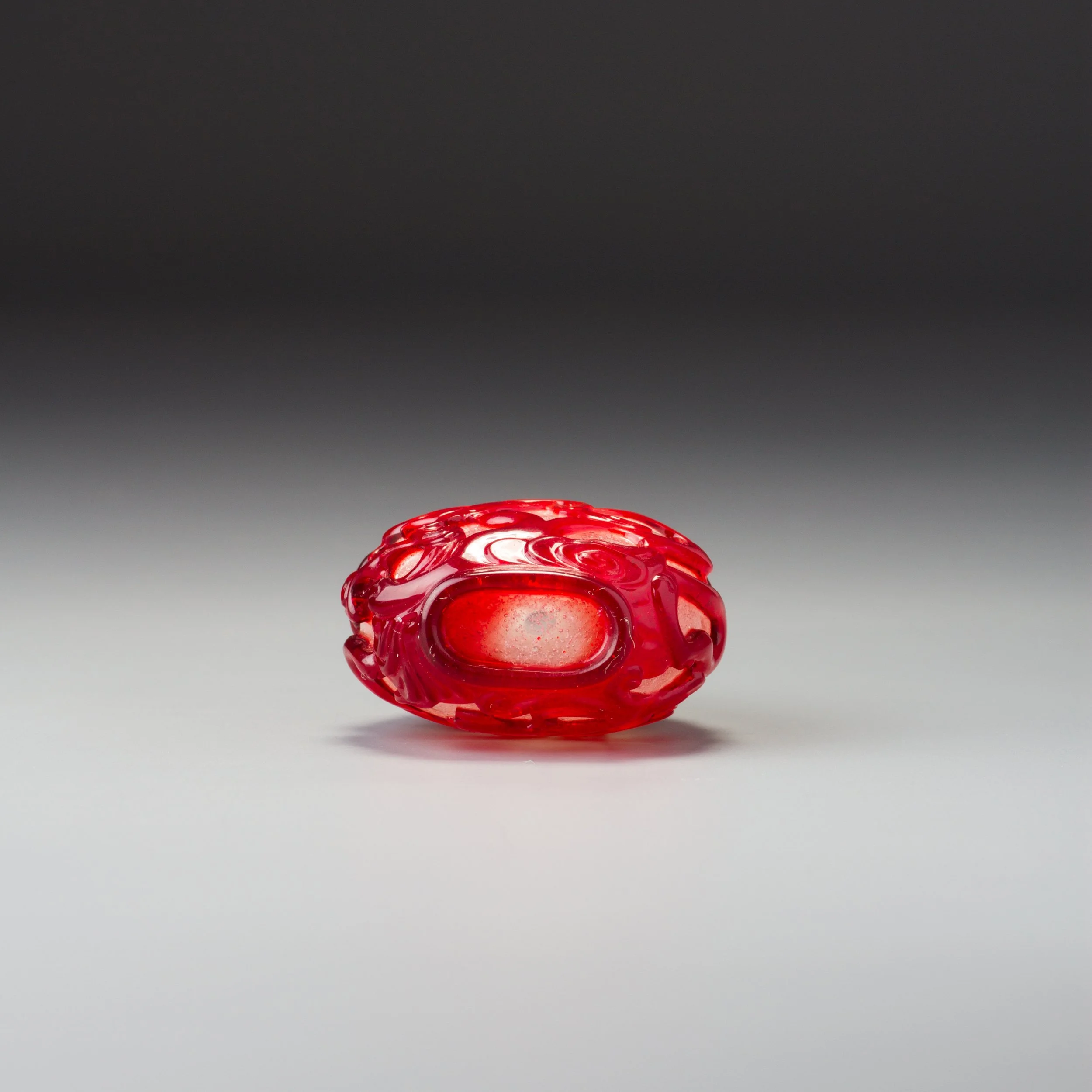 Transparent ruby-red and bubble- and white-fragment suffused colourless glass; with a relatively wide mouth, flat lip, and recessed, slightly convex oval foot surrounded by a protruding convex oval foot rim; carved as a single overlay with a continuous scene of two chi dragons amidst formalized clouds