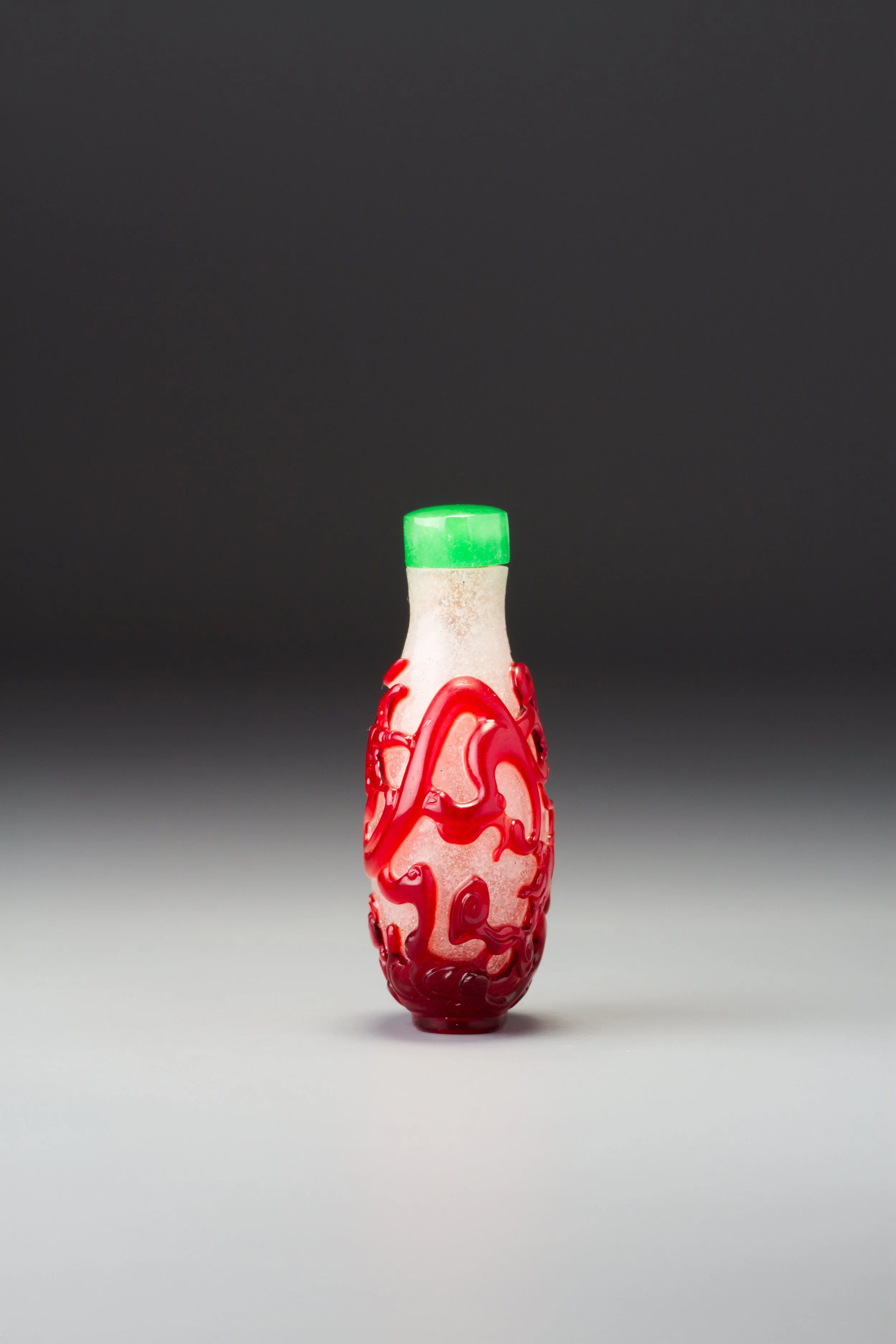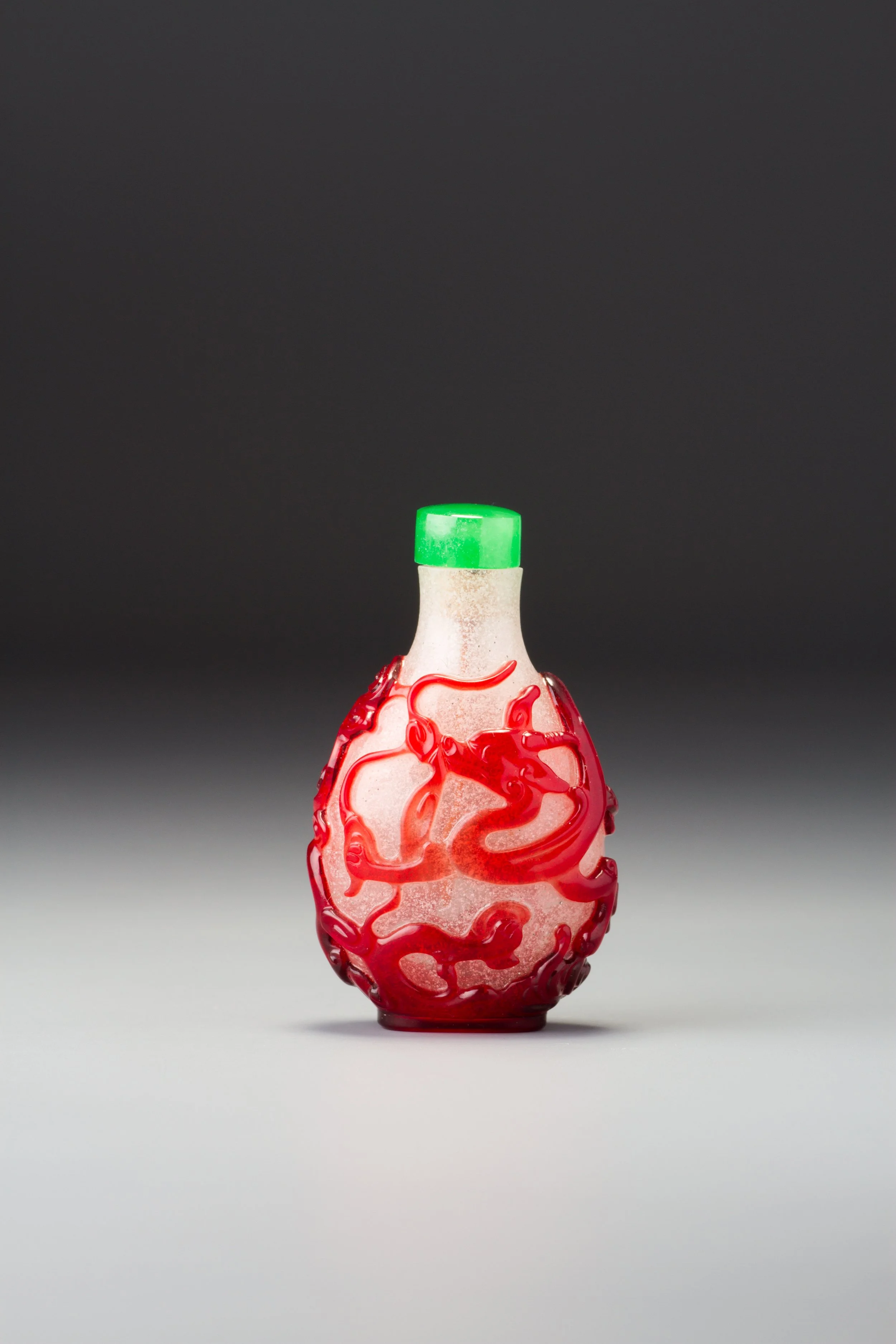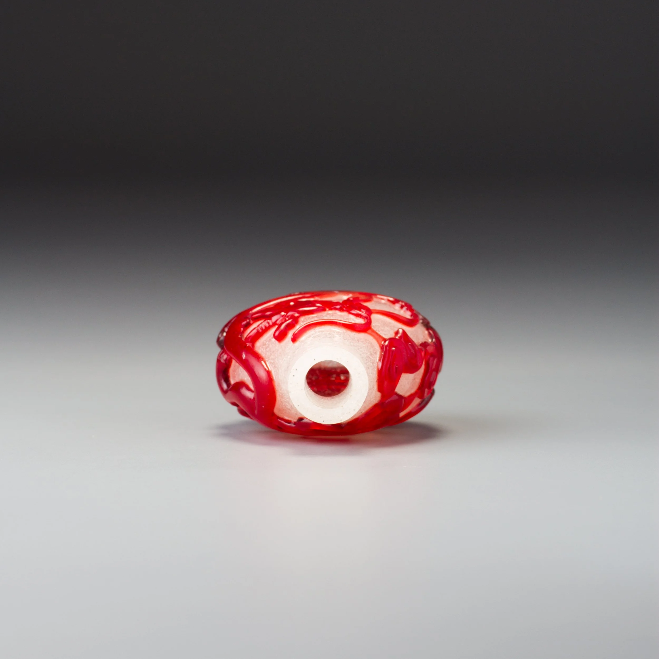 Transparent ruby-red and bubble- and white-fragment suffused colourless glass; with a relatively wide mouth, flat lip, and recessed, slightly convex oval foot surrounded by a protruding convex oval foot rim; carved as a single overlay with a continuous scene of two chi dragons amidst formalized clouds