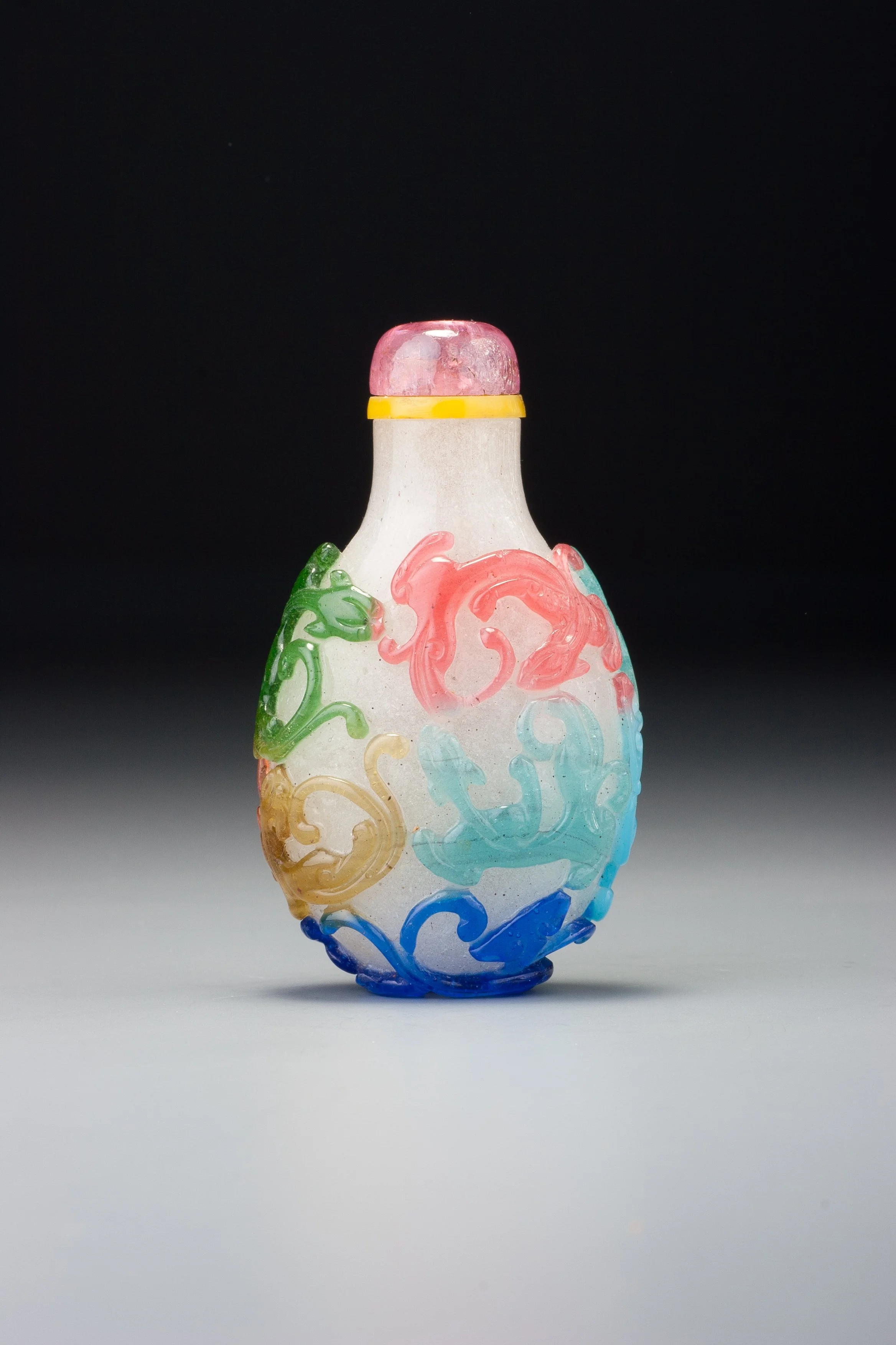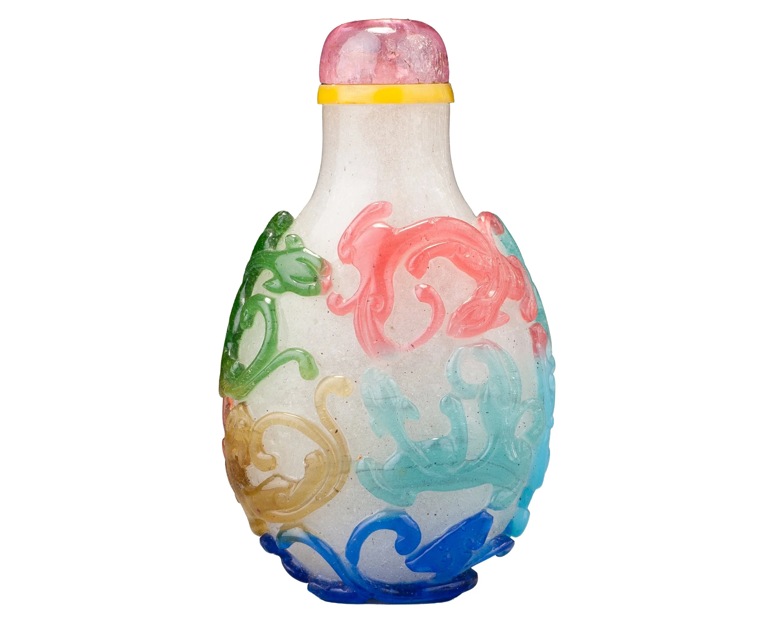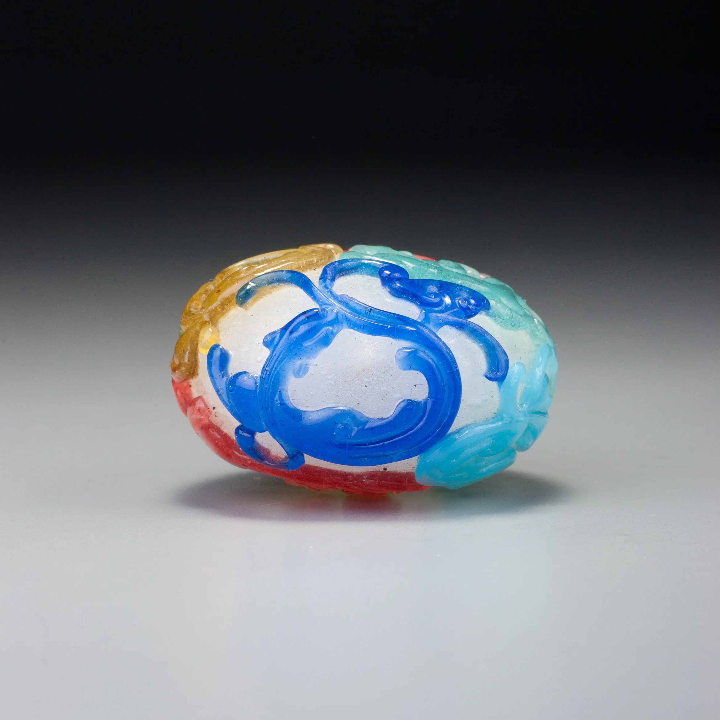 Transparent, pale ruby-red, sapphire-blue, emerald-green, slightly greenish-yellow, aquamarine-blue, translucent turquoise-blue, and slightly milky colourless glass, all suffused with air bubbles of various sizes; with a slightly concave lip and recessed, convex, oval foot surrounded by a protruding foot rim made up of elements of the design; carved as a single overlay with a continuous design of nine chi dragons, one, at the base of the bottle with a lingzhi growing nearby and another lingzhi held in the mouth of one of the dragons