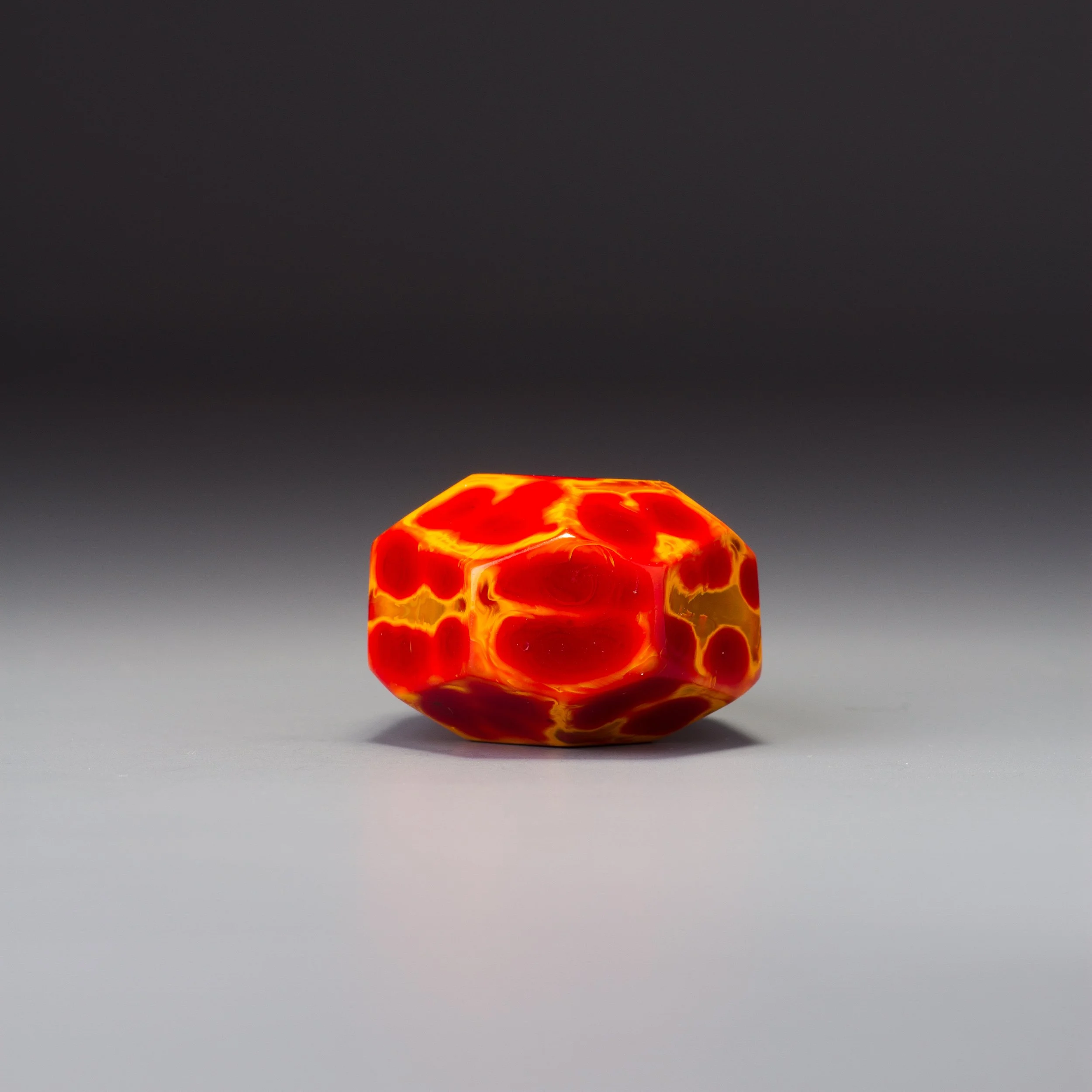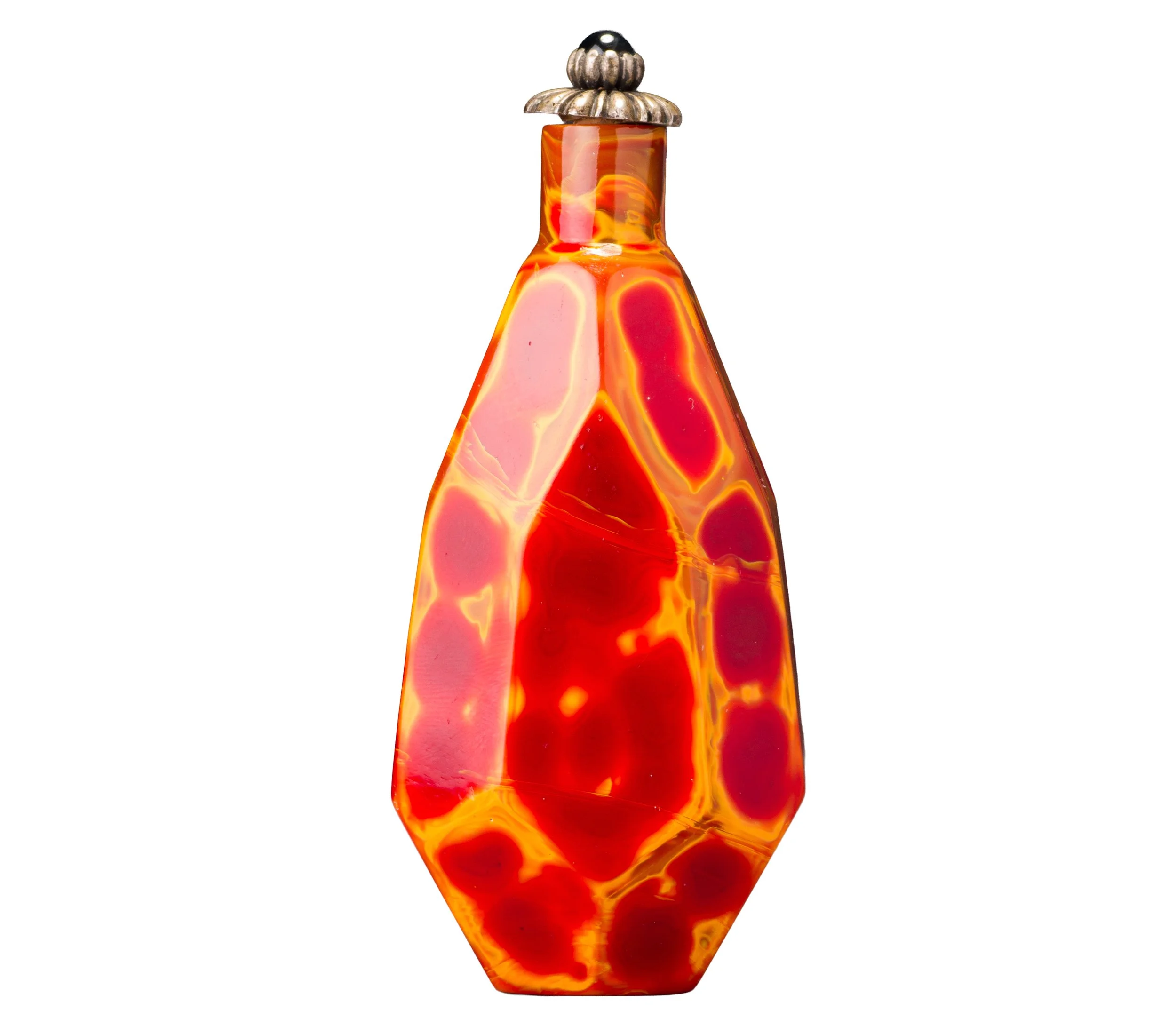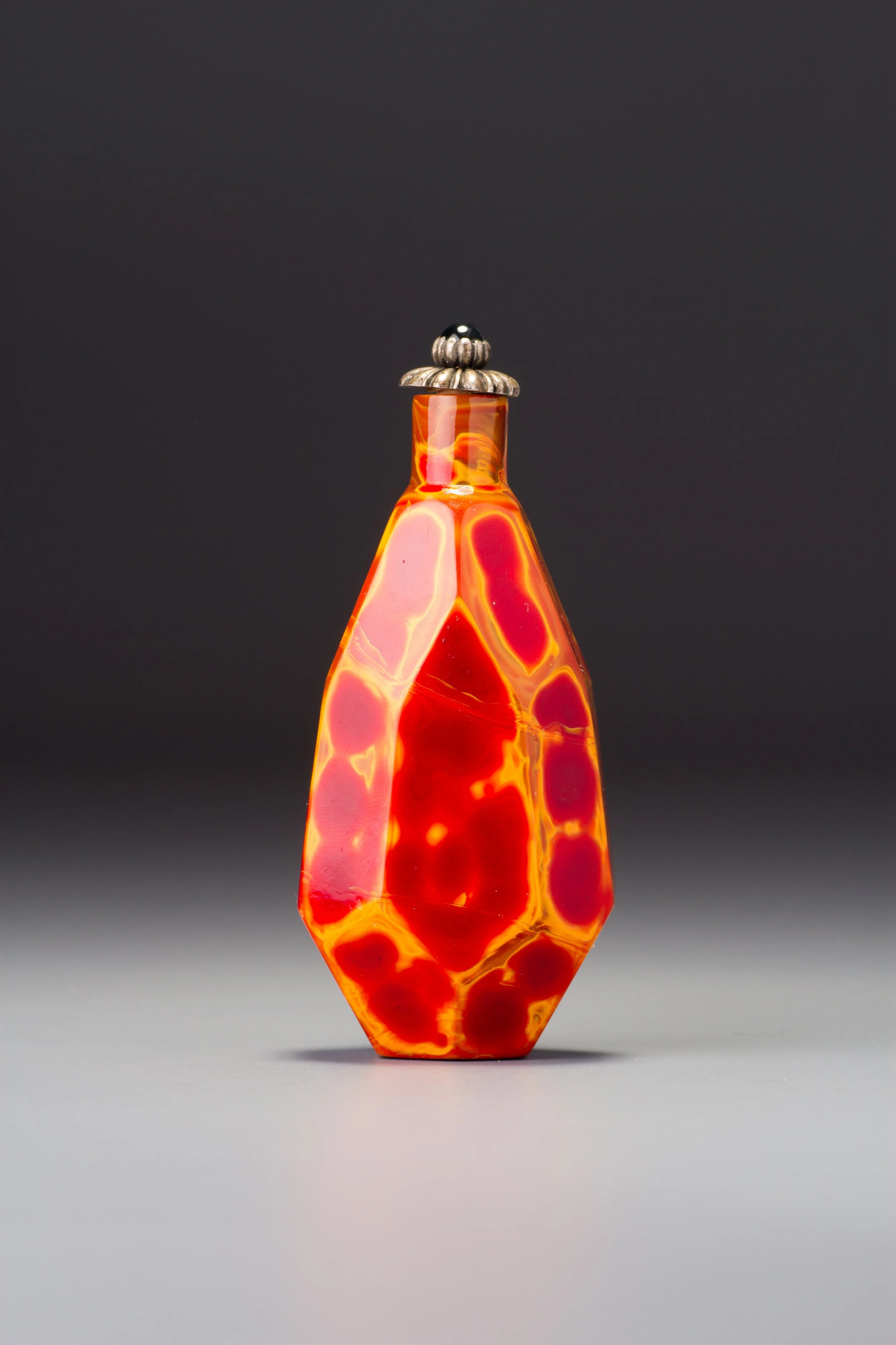 Ruby-red, orange-yellow and yellow-ochre glass (of the variety known as ‘realgar glass’); with a flat lip and flat hexagonal foot; the elongated pear shape faceted overall with four, five and six sided panels.