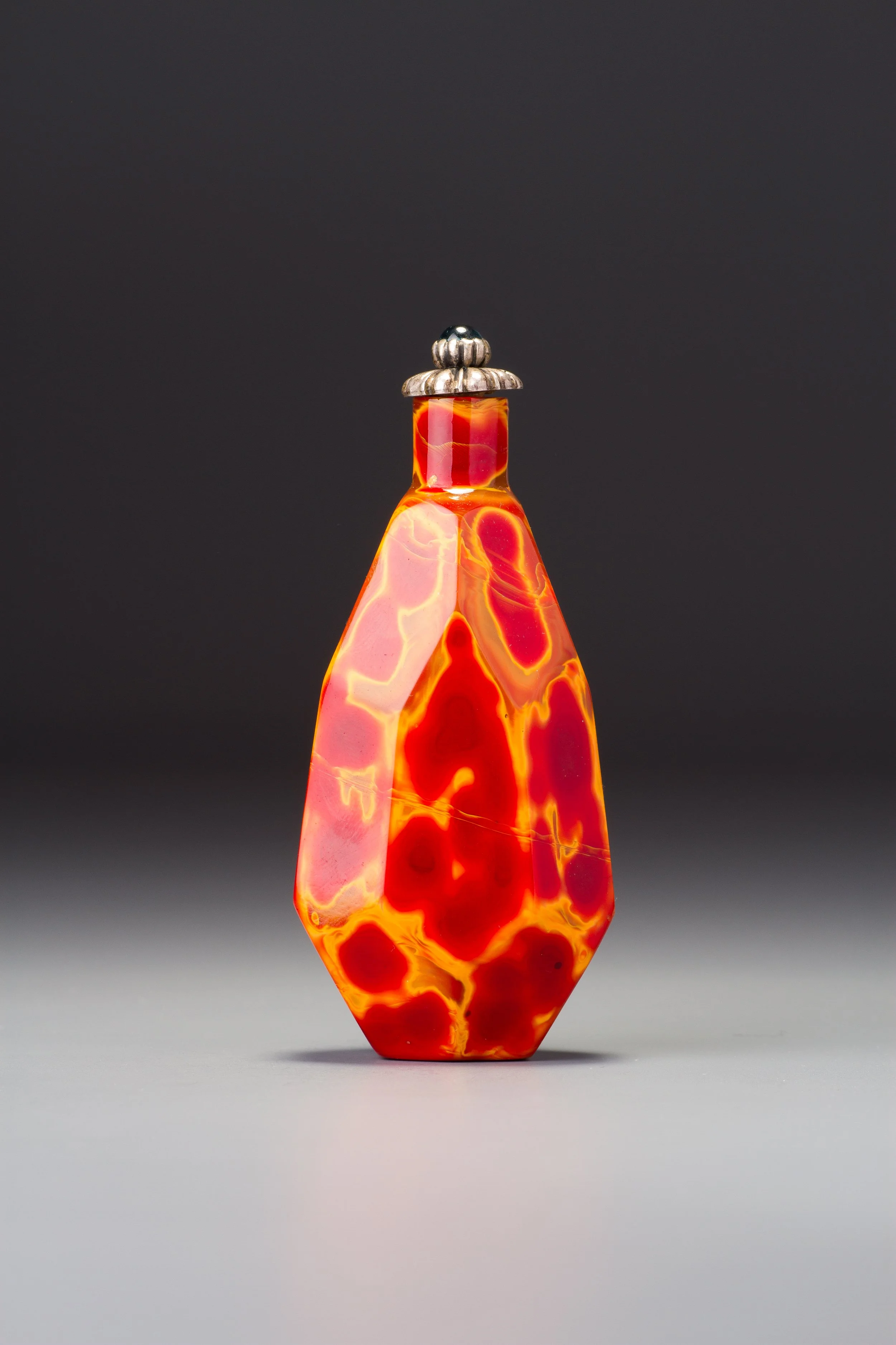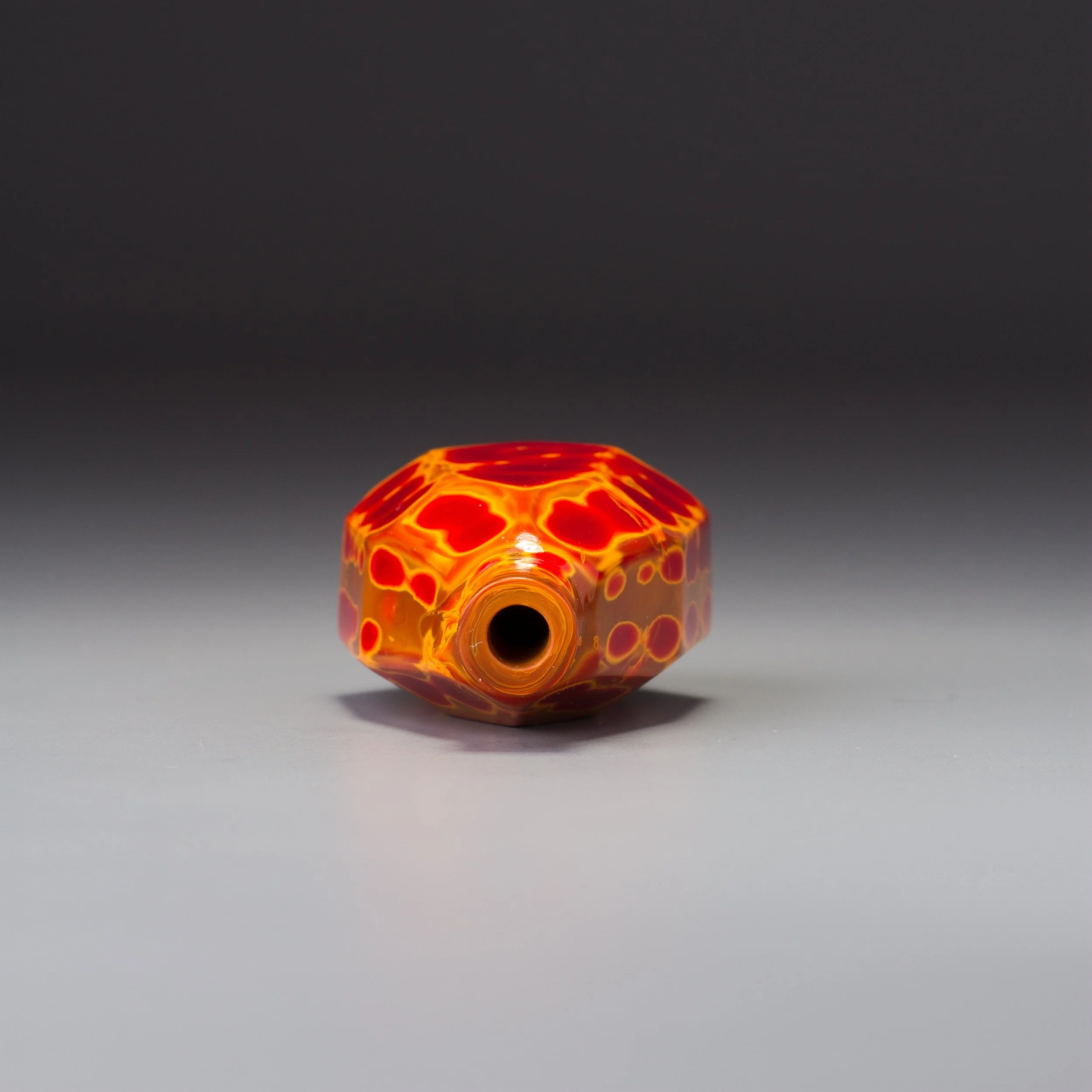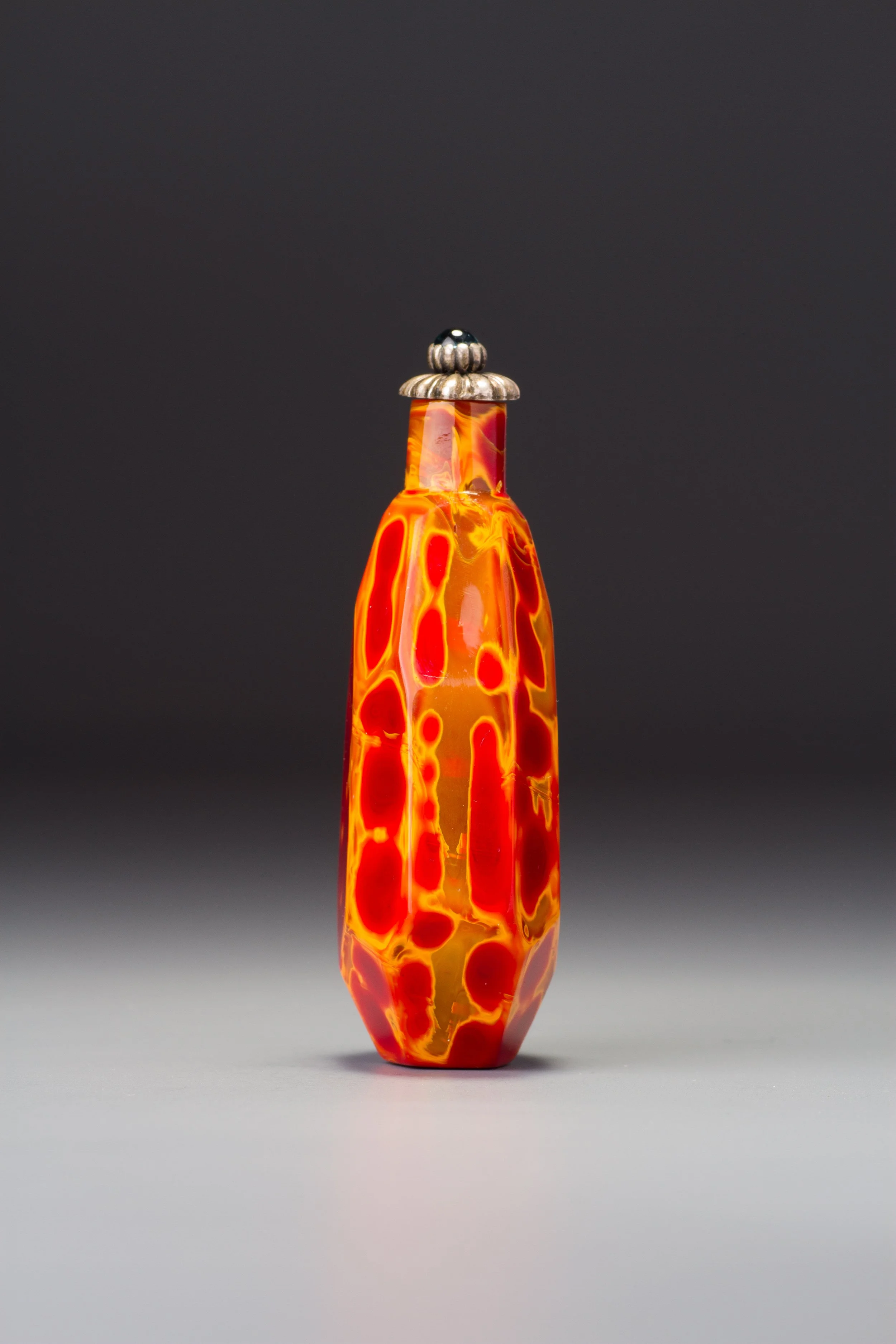 Ruby-red, orange-yellow and yellow-ochre glass (of the variety known as ‘realgar glass’); with a flat lip and flat hexagonal foot; the elongated pear shape faceted overall with four, five and six sided panels.