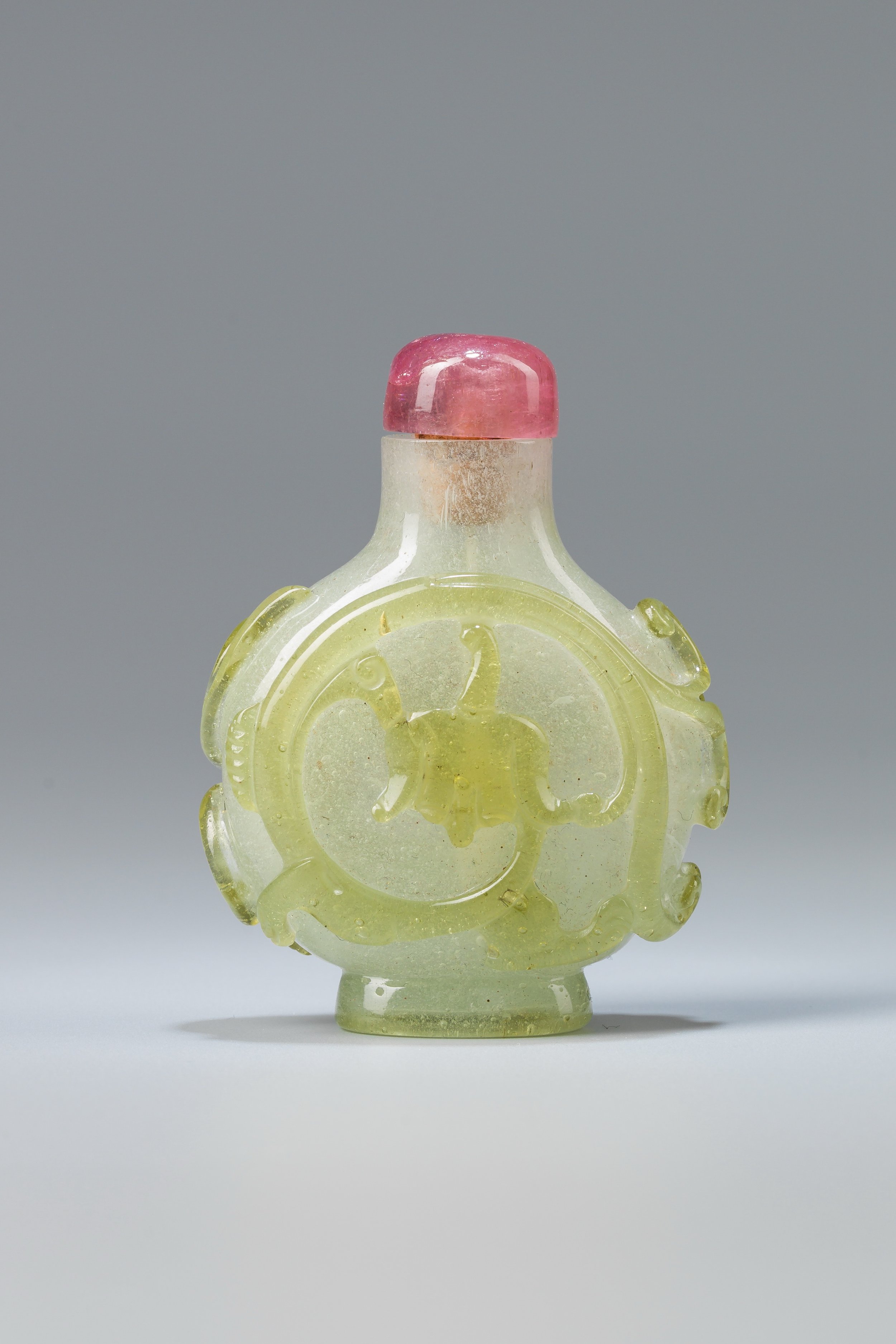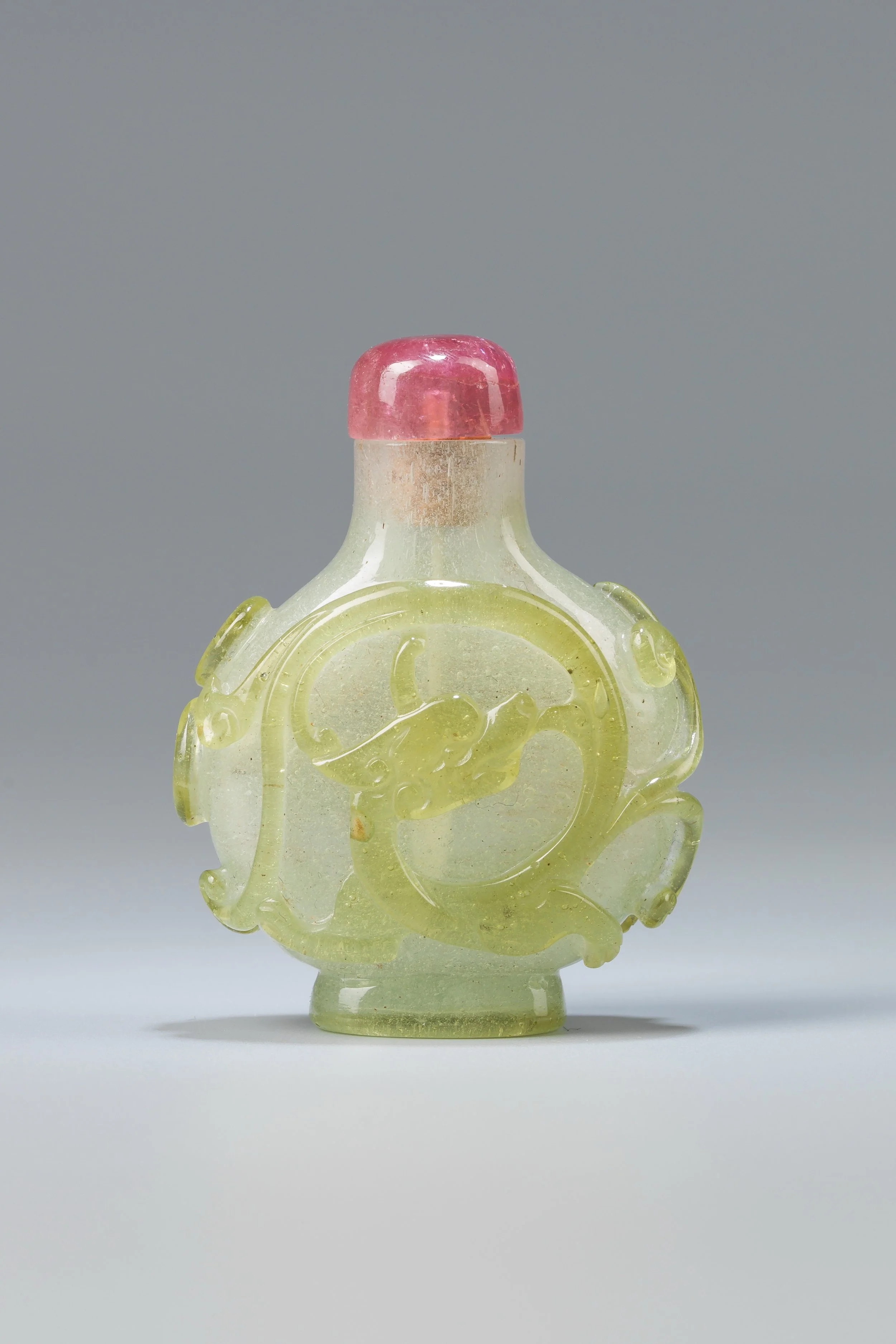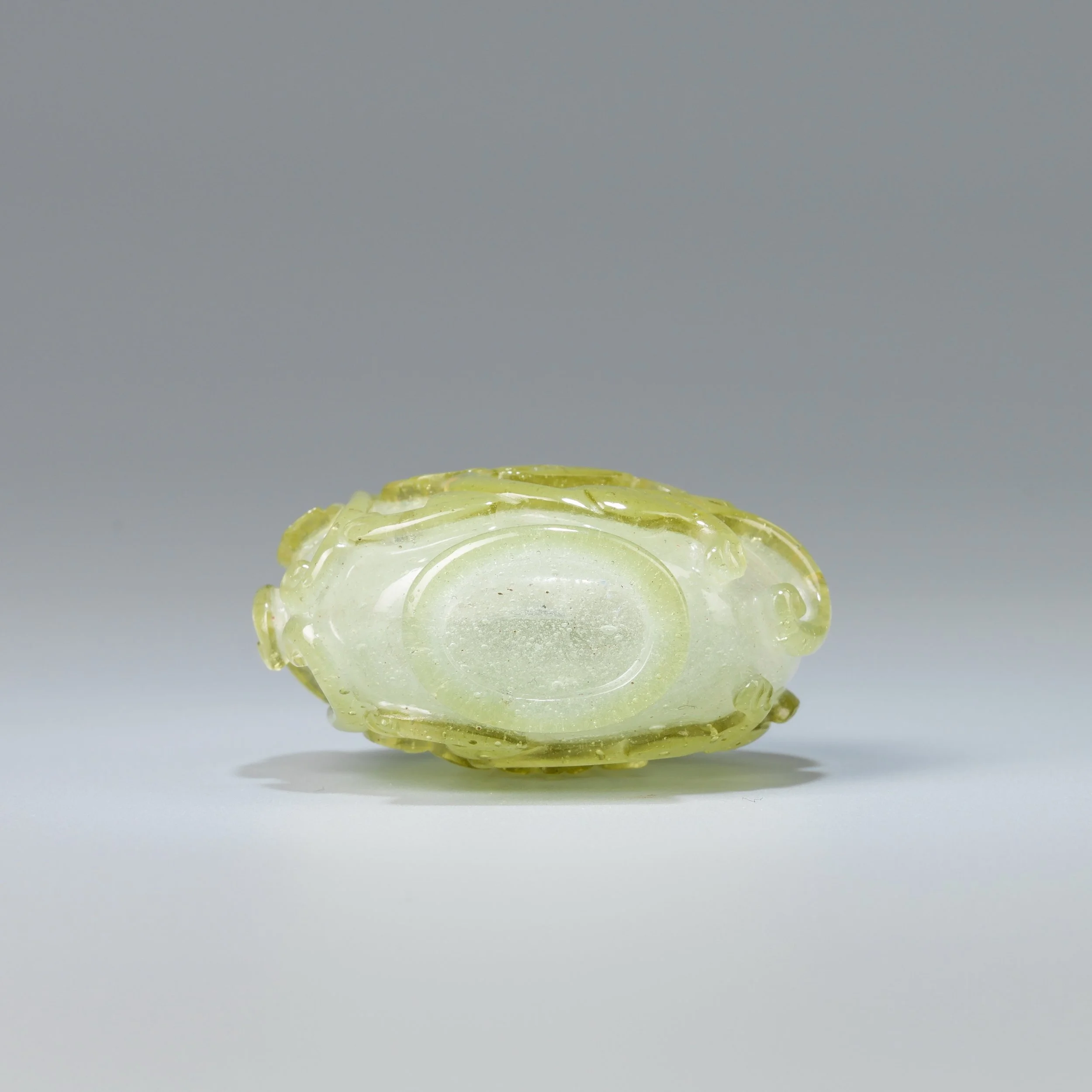 Transparent, pale lime-green and bubble-suffused colourless glass; with a flat lip, convex foot and convex footrim; carved as a single overlay with a chi dragon on each main side, their foliate tails curling round onto the narrow sides.