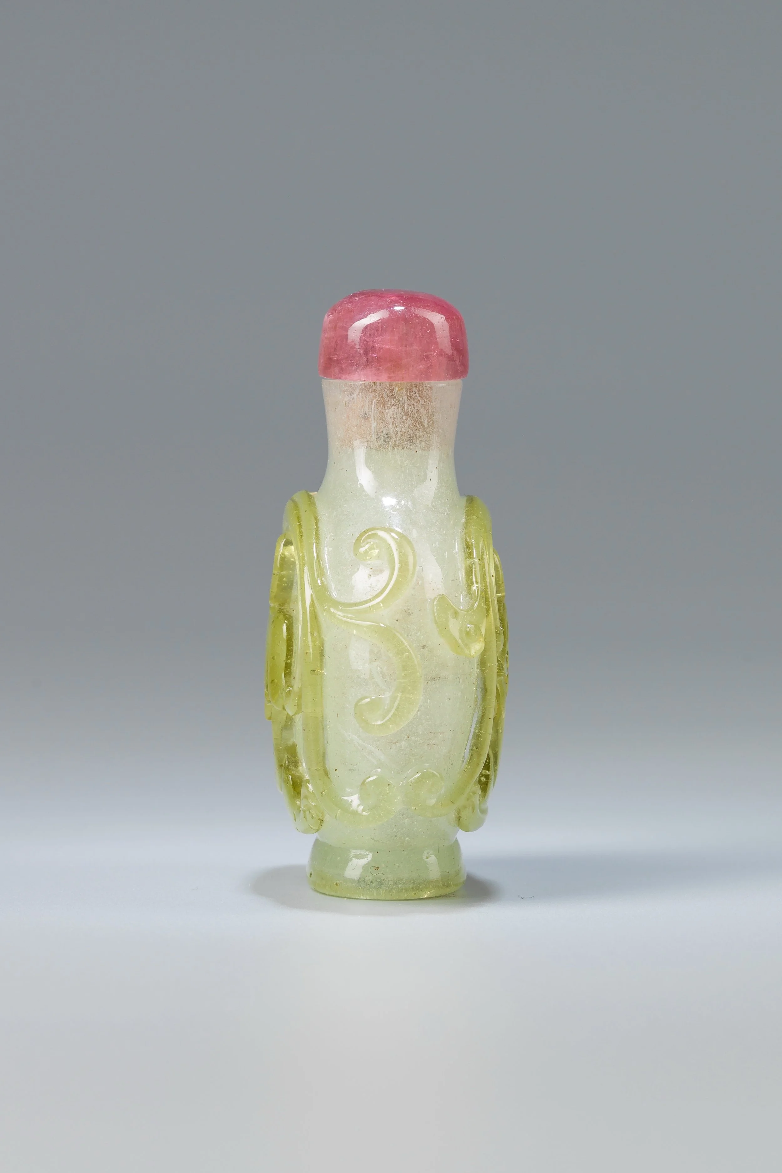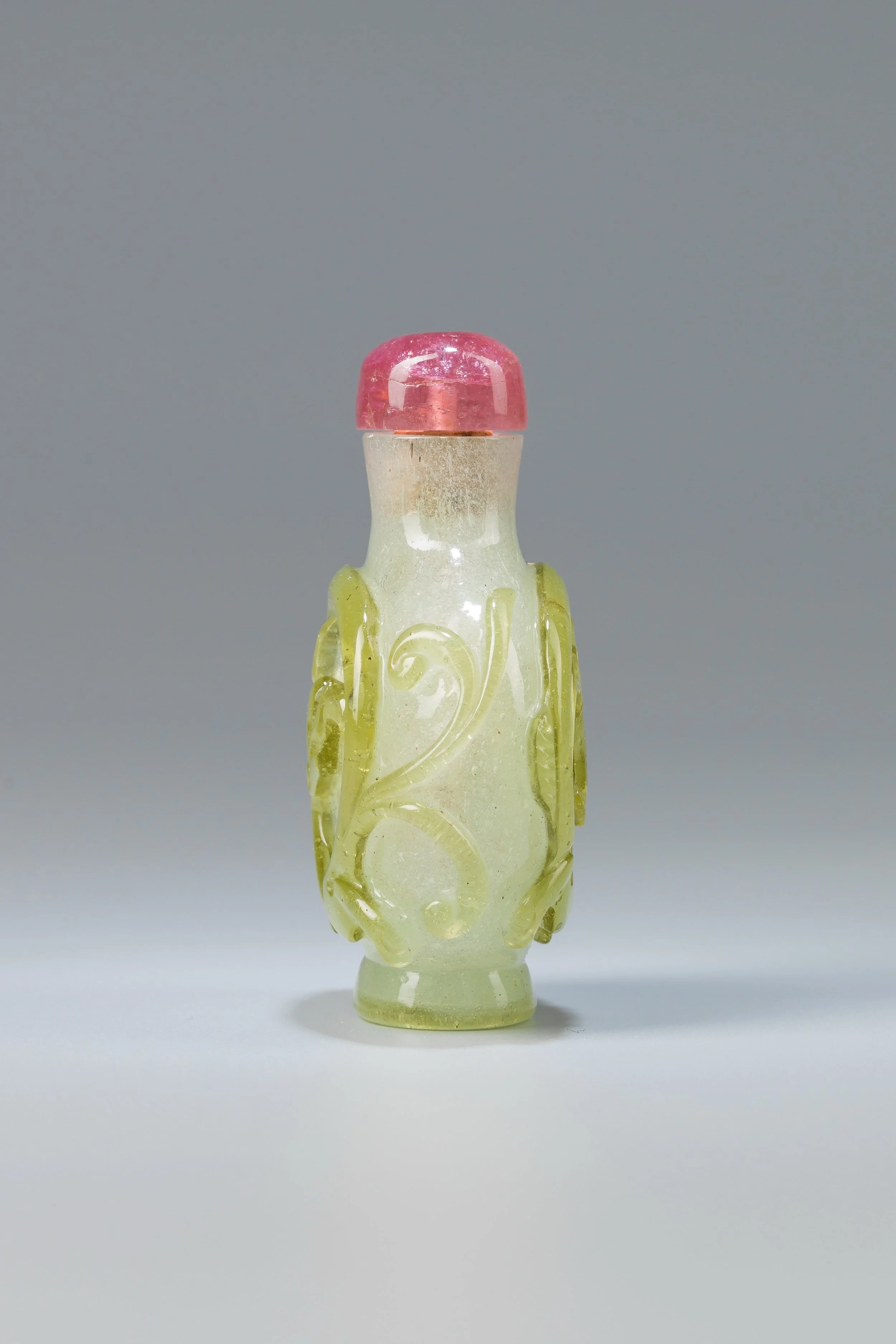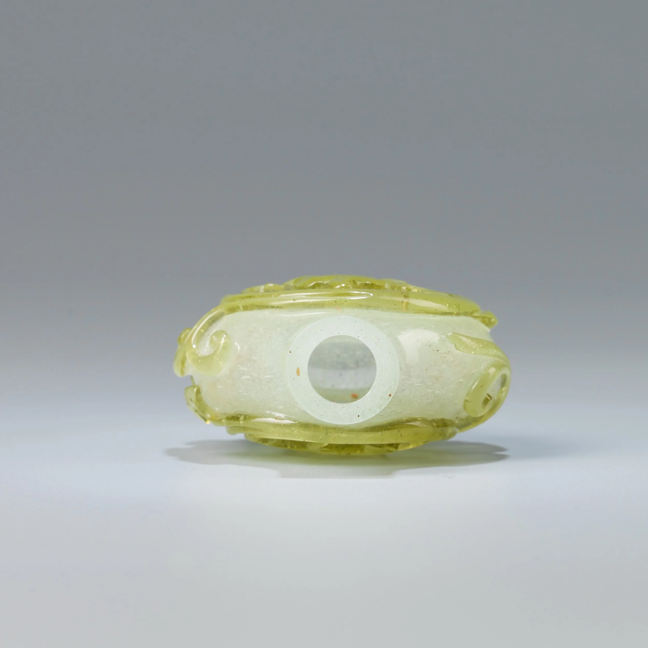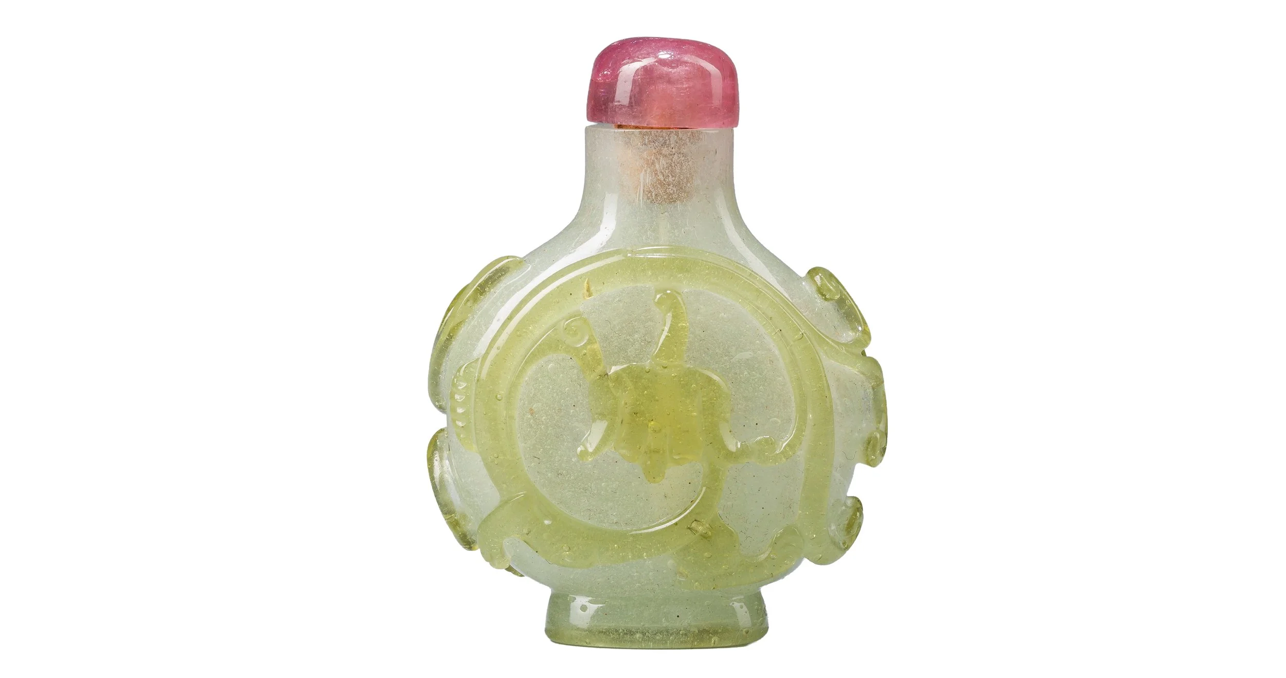 Transparent, pale lime-green and bubble-suffused colourless glass; with a flat lip, convex foot and convex footrim; carved as a single overlay with a chi dragon on each main side, their foliate tails curling round onto the narrow sides.