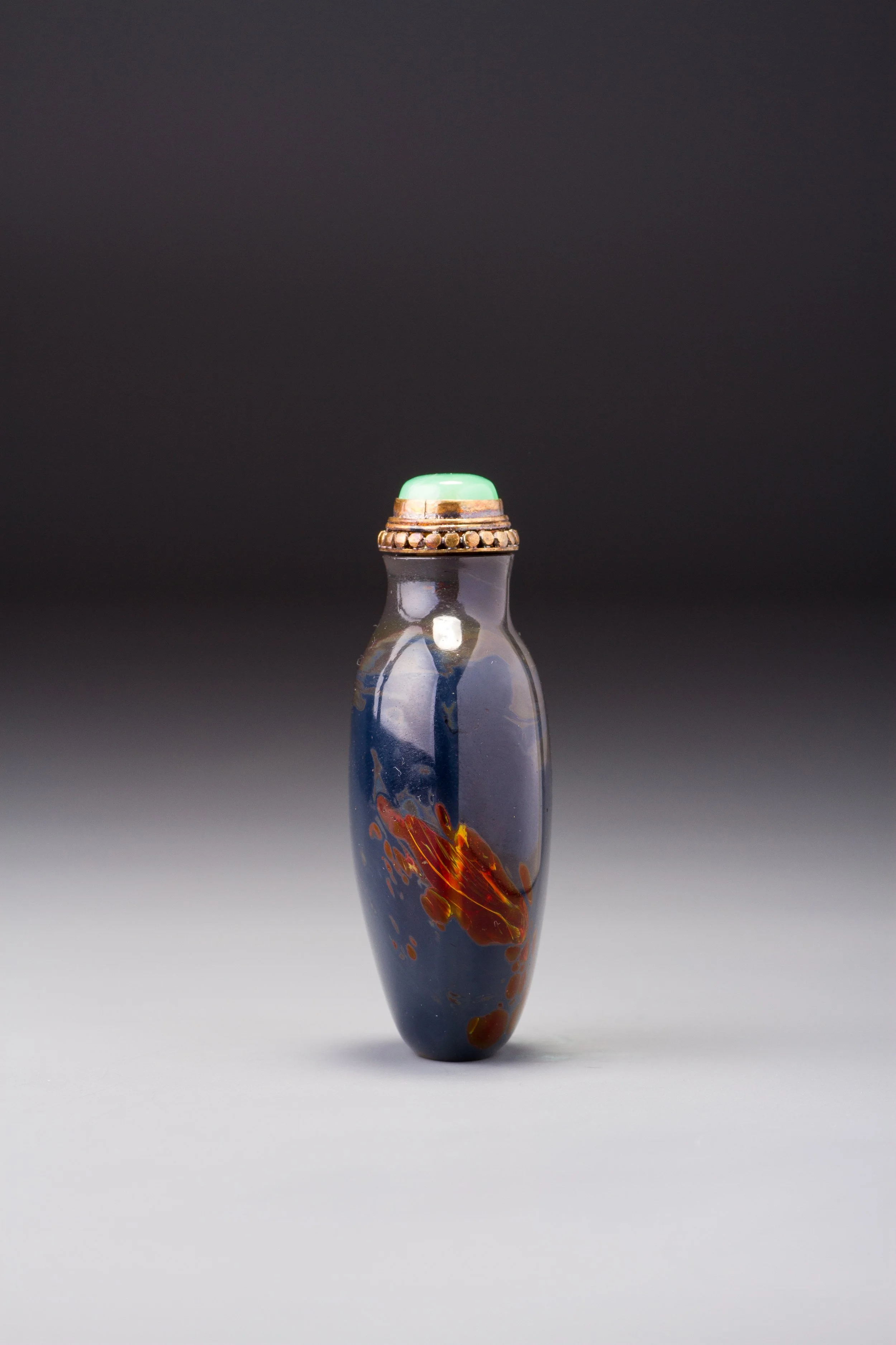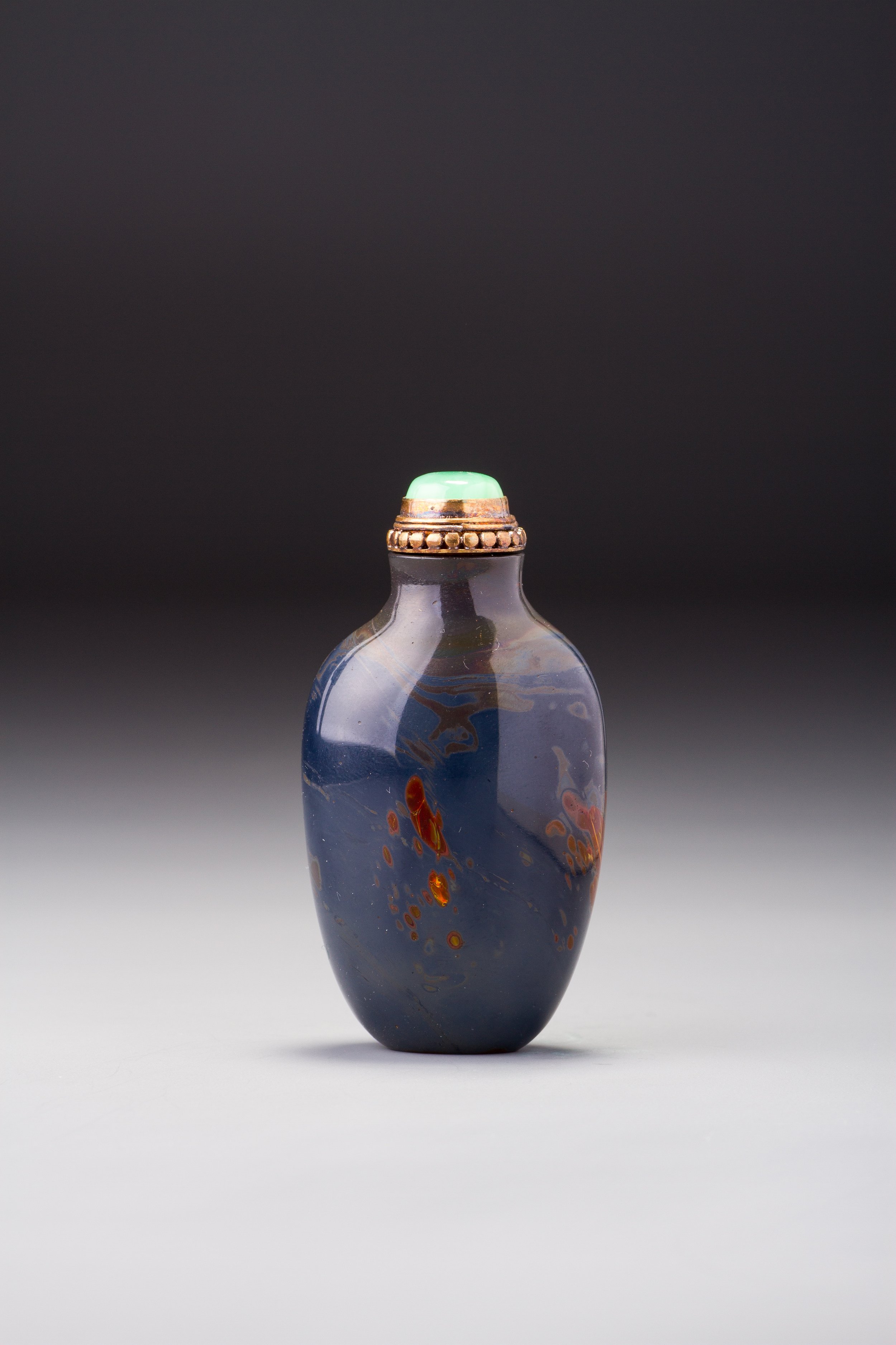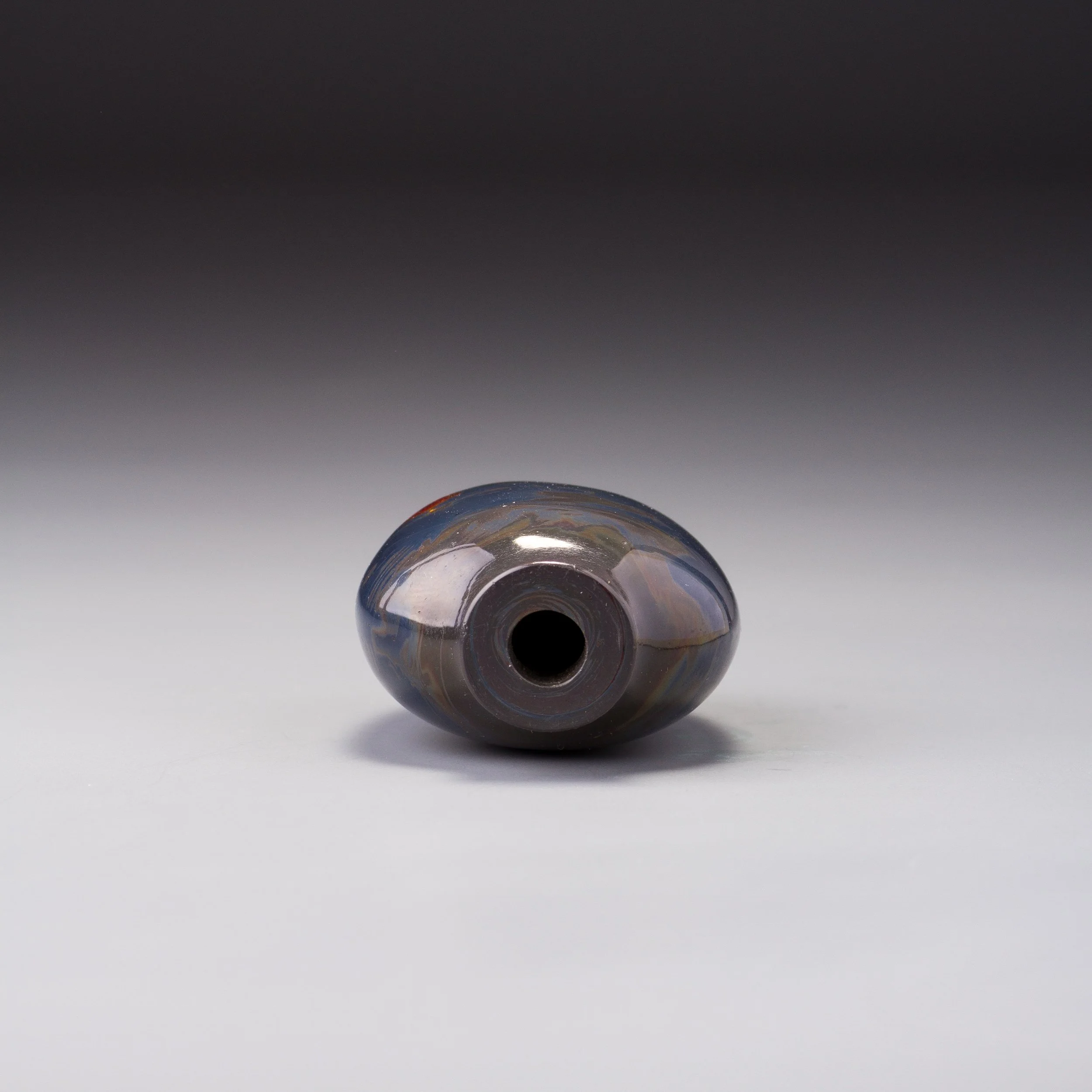 Ruby-red, orange-yellow, orange-brown, reddish mahogany-brown, mauve-grey and brownish-grey glass; of compressed ovoid form with a waisted cylindrical neck, flat lip and flat oval foot, with a few splashes of realgar-glass on a mauve-grey and brownish-grey ground.