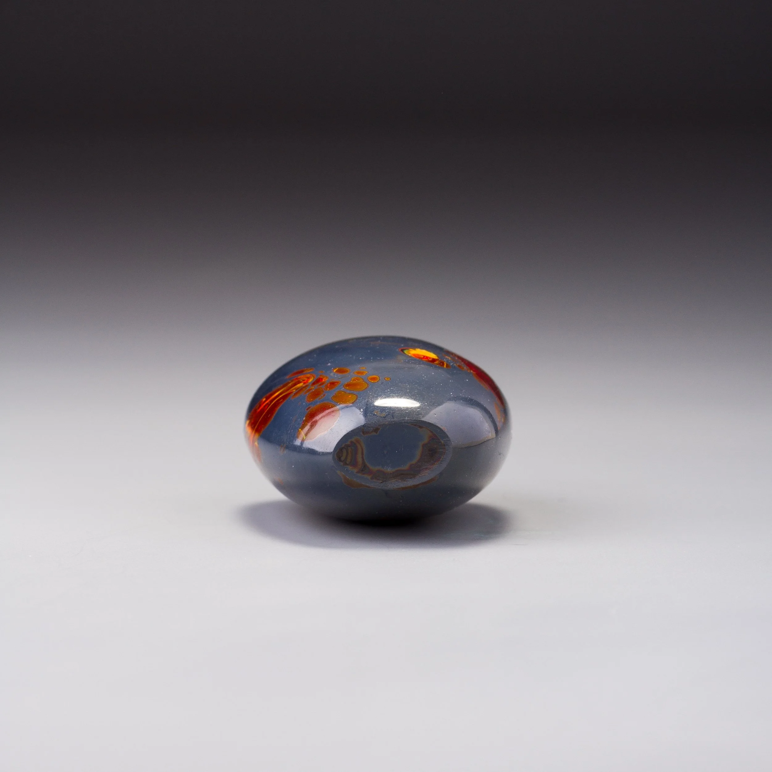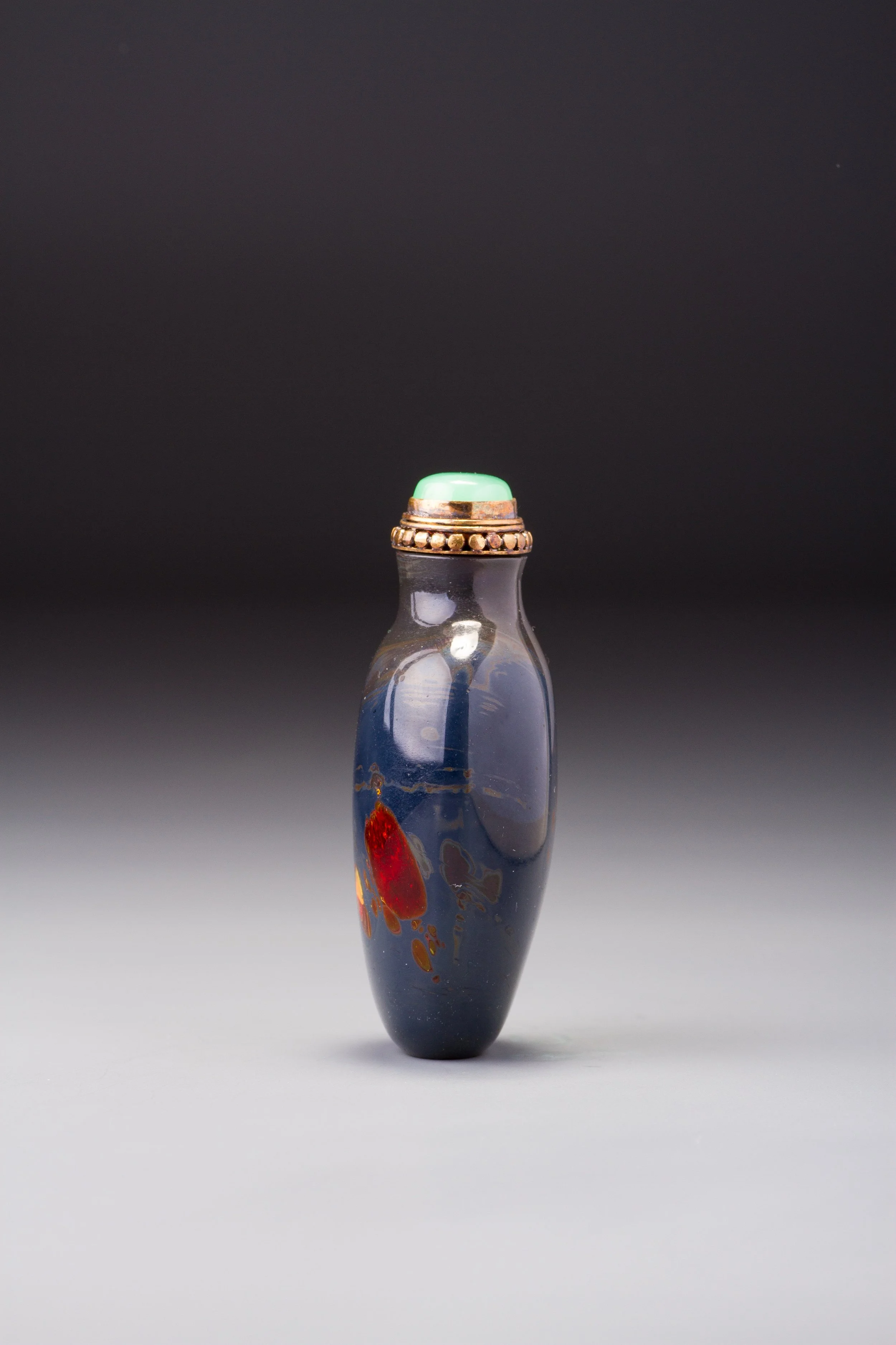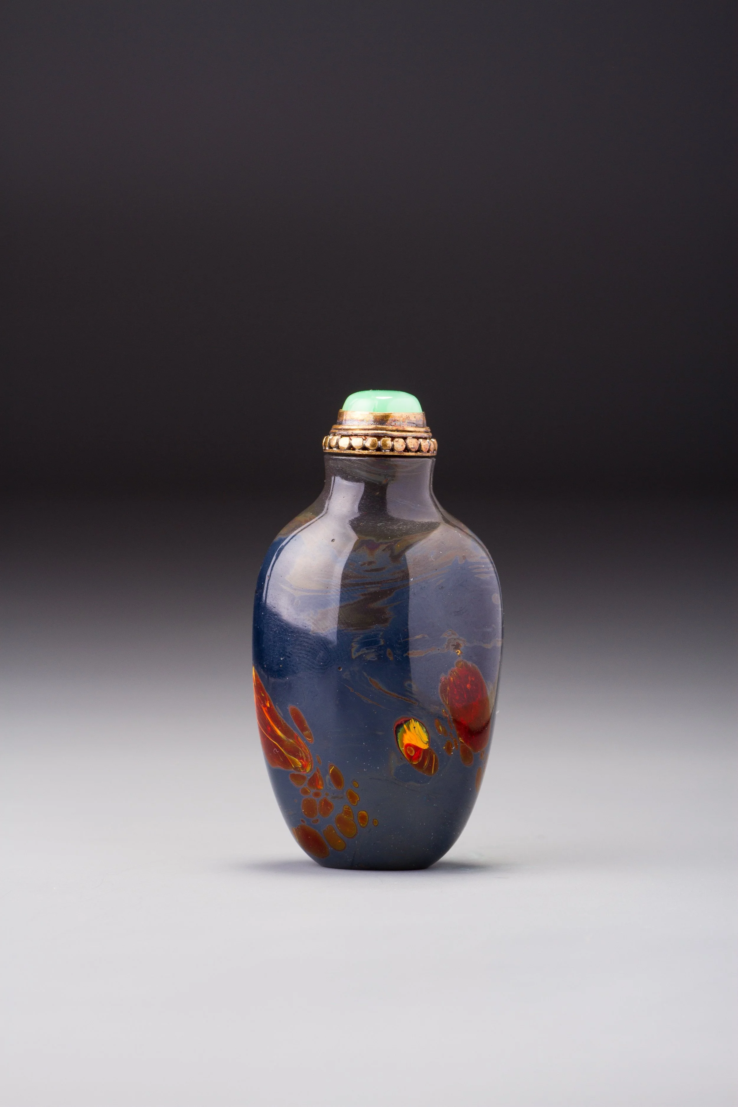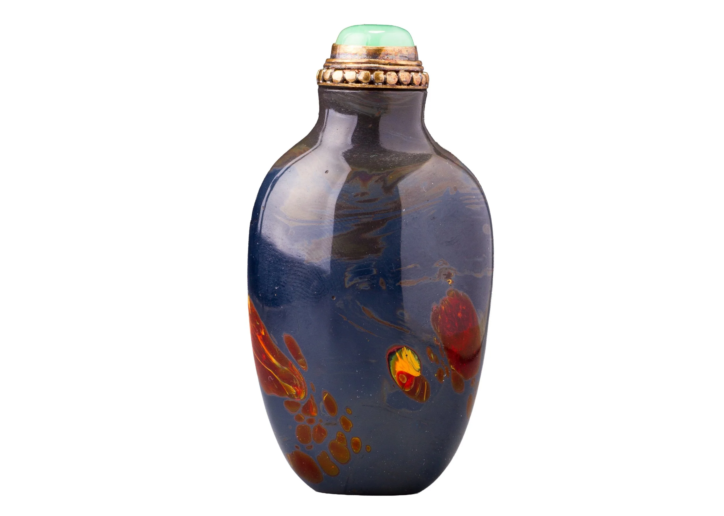 Ruby-red, orange-yellow, orange-brown, reddish mahogany-brown, mauve-grey and brownish-grey glass; of compressed ovoid form with a waisted cylindrical neck, flat lip and flat oval foot, with a few splashes of realgar-glass on a mauve-grey and brownish-grey ground.