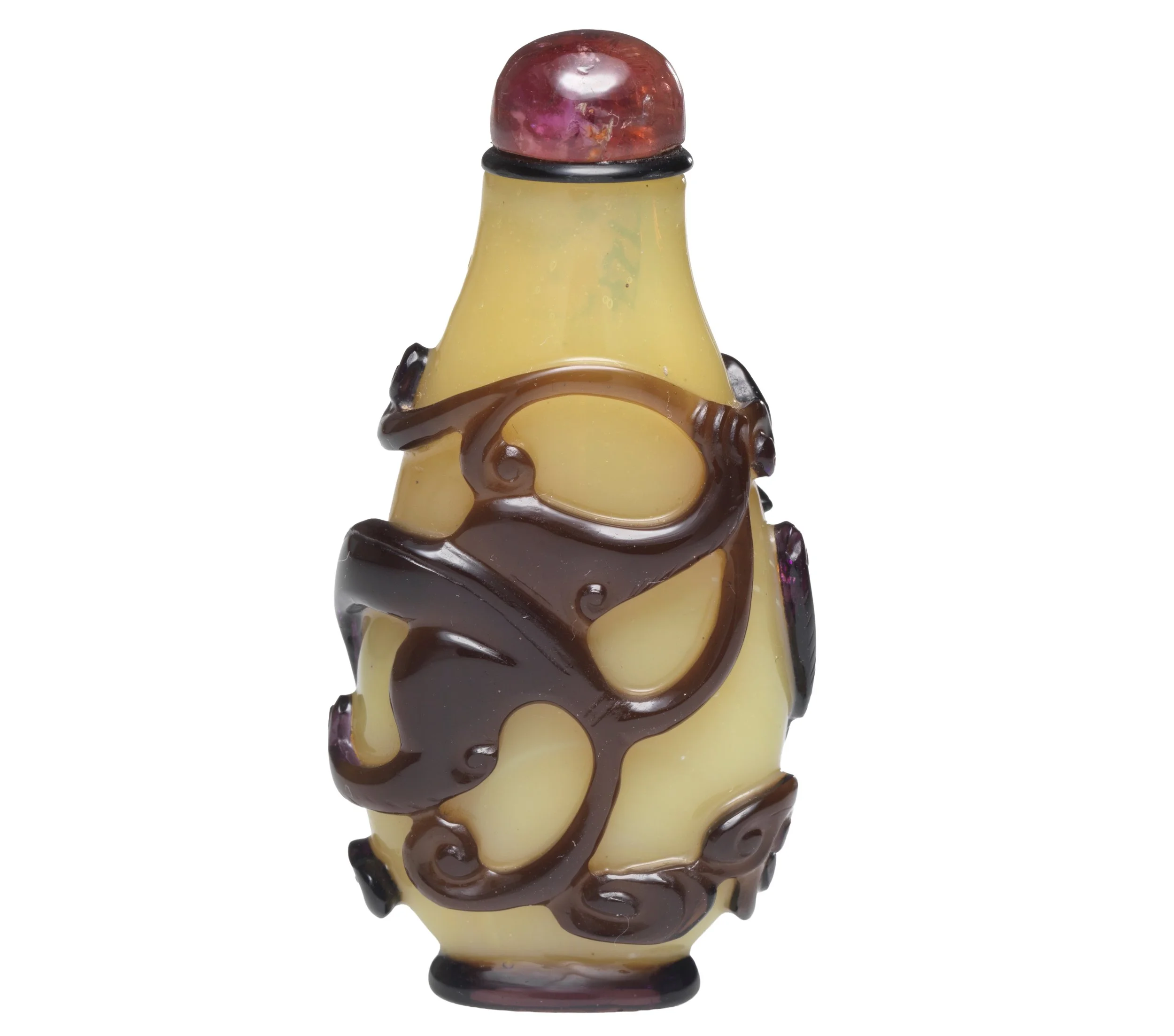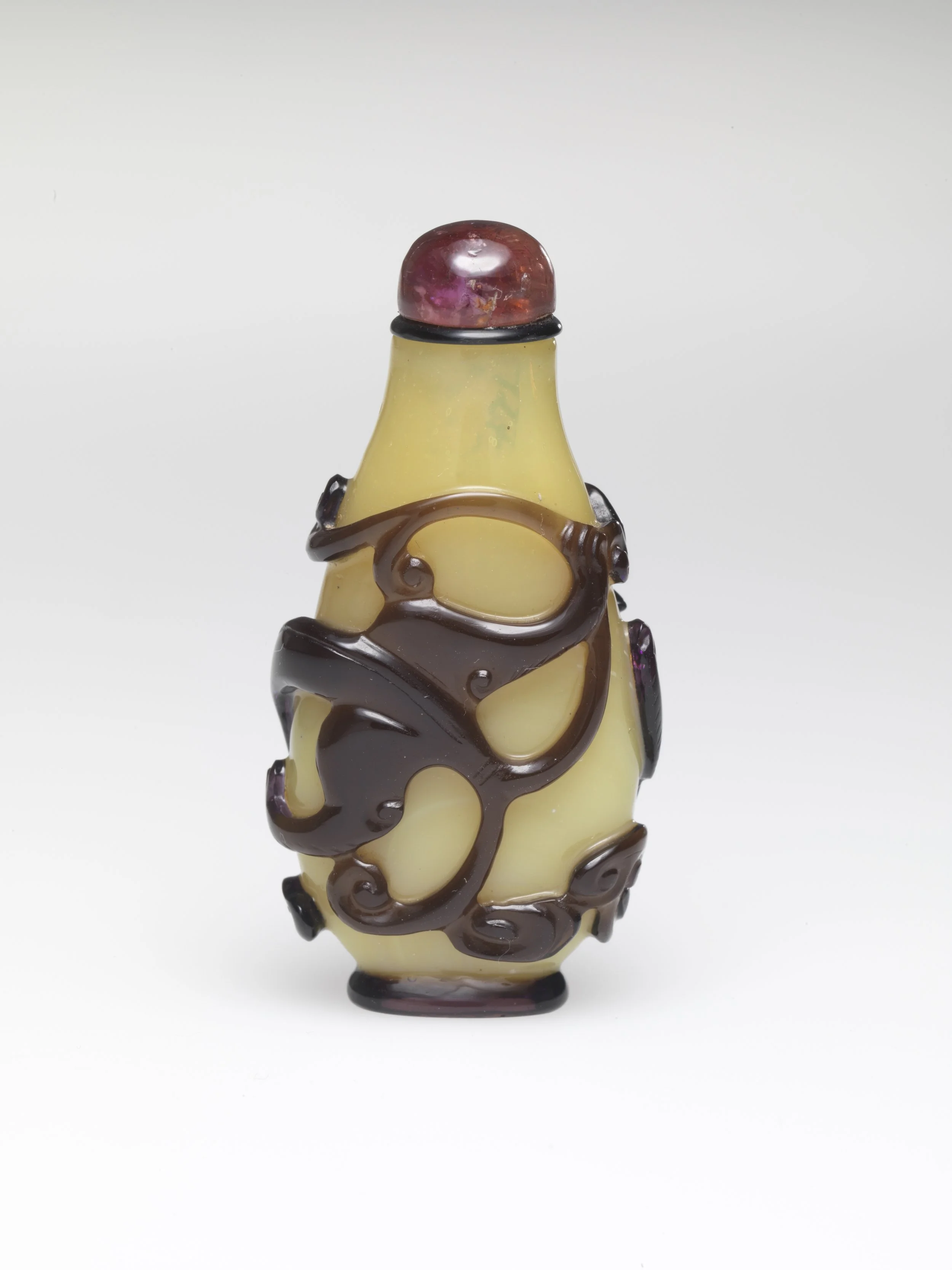 Transparent, dark olive-brown and translucent yellow glass; of compressed, elongated pear shape tapering to a cylindrical neck, flat lip and with a recessed, flat oval foot surrounded by a protruding rounded oval footrim; the darker colour carved in relief as a single overlay with a chi dragon and cloud scrolls, the foot in the overlay colour.