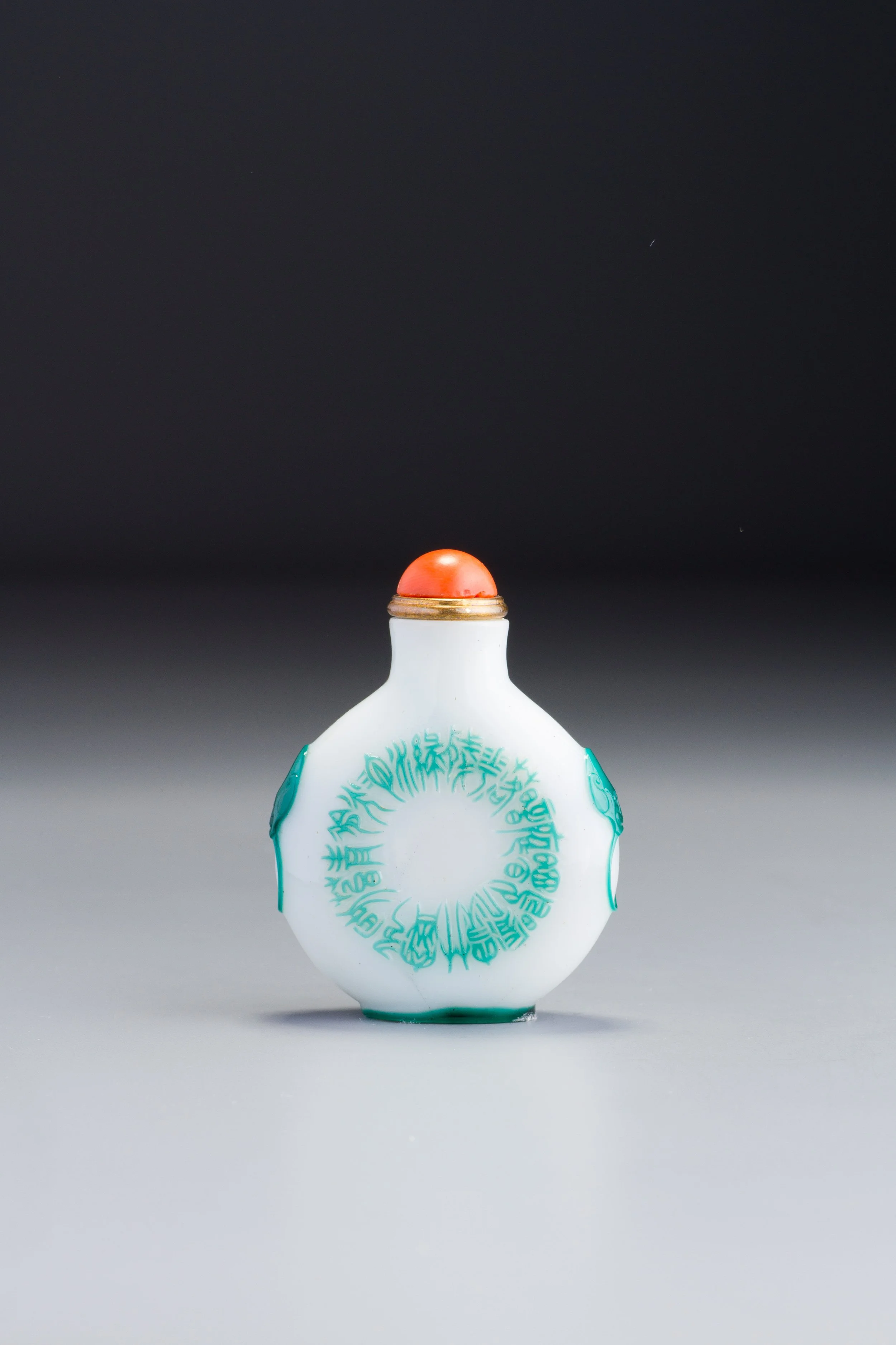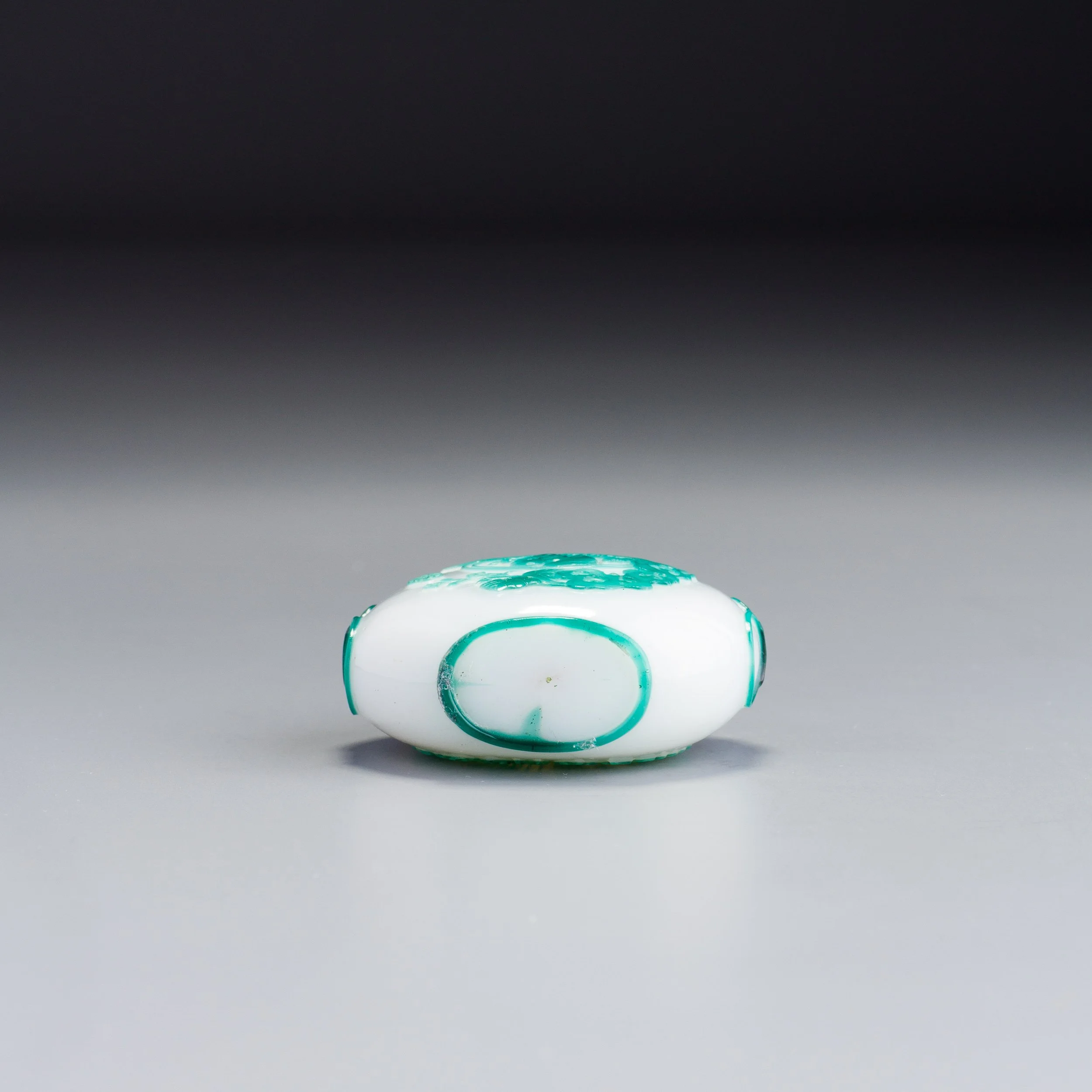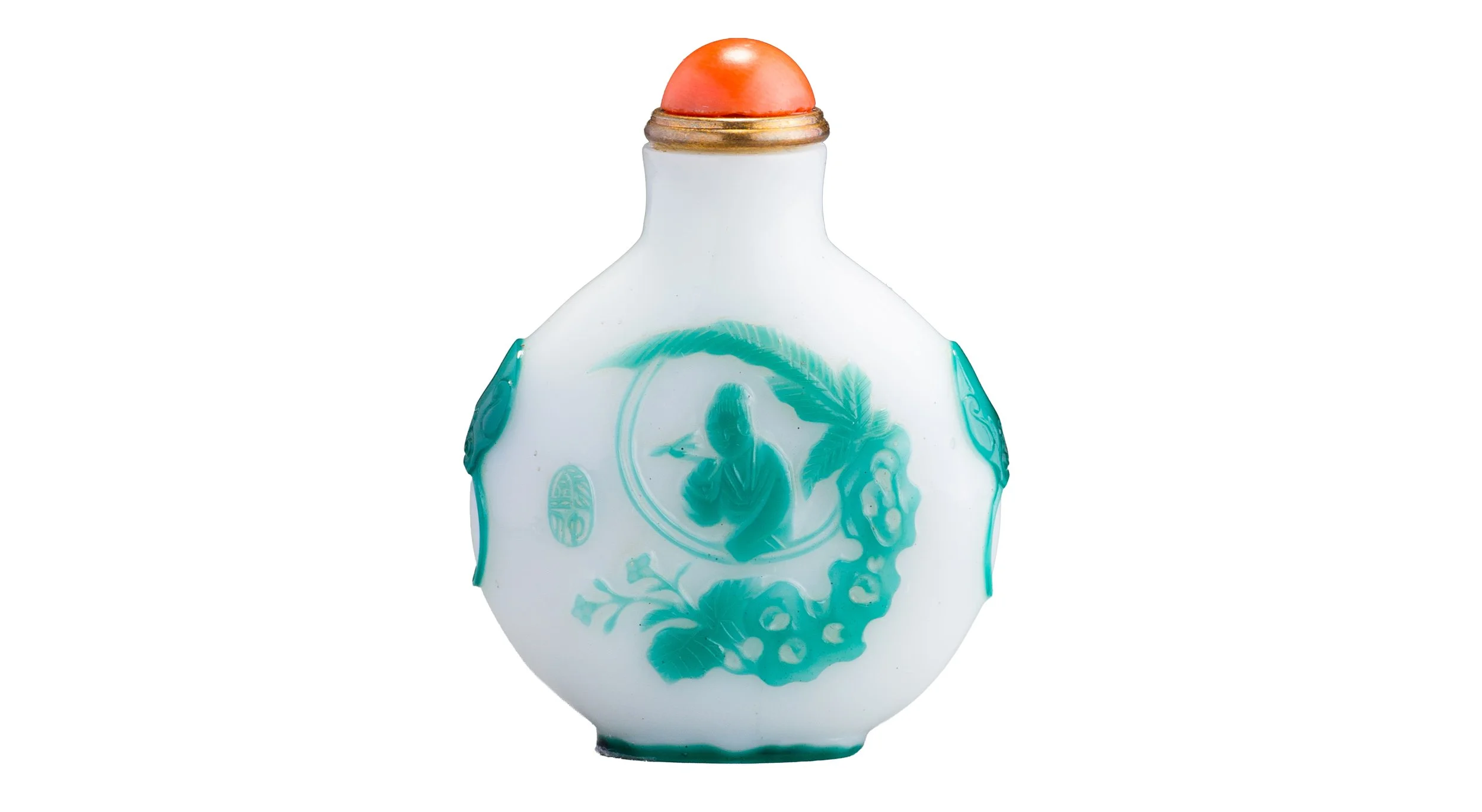 Transparent emerald-green and translucent white glass; of compressed spherical form with a slightly flared, cylindrical neck, flat lip, and recessed convex, oval foot surrounded by a protruding flat, oval foot rim; carved as a single overlay of green on white with, on one main side, a woman, holding an orchid in her hand and gazing out of a circular window at a garden scene of an ornamental rock sculpture, a plantain, and a flowering plant, with a seal, also in the overlay colour, the other main side with a ‘palindrome’ (circular poem) in seal-script characters, the narrow sides with mask-and-ring handles, the foot rim in the overlay colour
